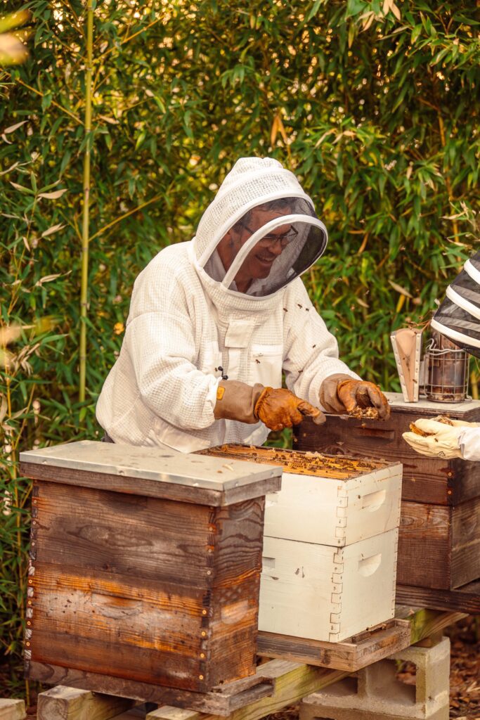 At the time, he was the global chairman of a worldwide organization. While in Geneva giving a presentation about economic development in developing countries, his wife called to inform him that a swarm of bees now called their back door home, and he advised her to call a pest control company. He winces, recalling seeing the powdered pesticides all over the door where their triplets, who were toddlers at the time, often crawled. Right there, with the economic impact of bees fresh in his mind, he silently vowed to learn all he could and help anyone who needed assistance relocating bees. Six months later, a swarm arrived in a tree next door, and he officially became a beekeeper.