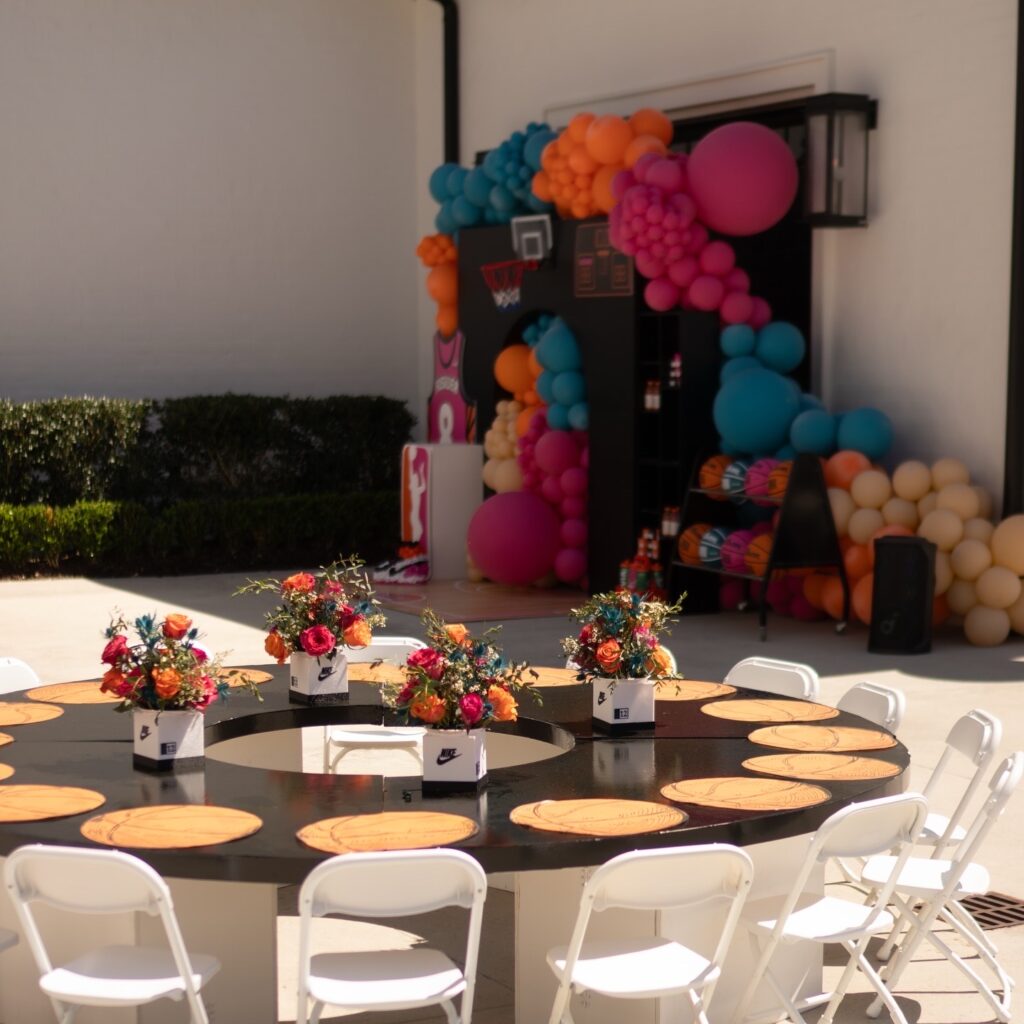 “Brittney and JD’s daughter is such a girly girl, and she’s fallen in love with basketball,” says Harden. “We talked over ideas for the party and landed on a basketball bash. Once I had the theme, I was given full creative control.”
