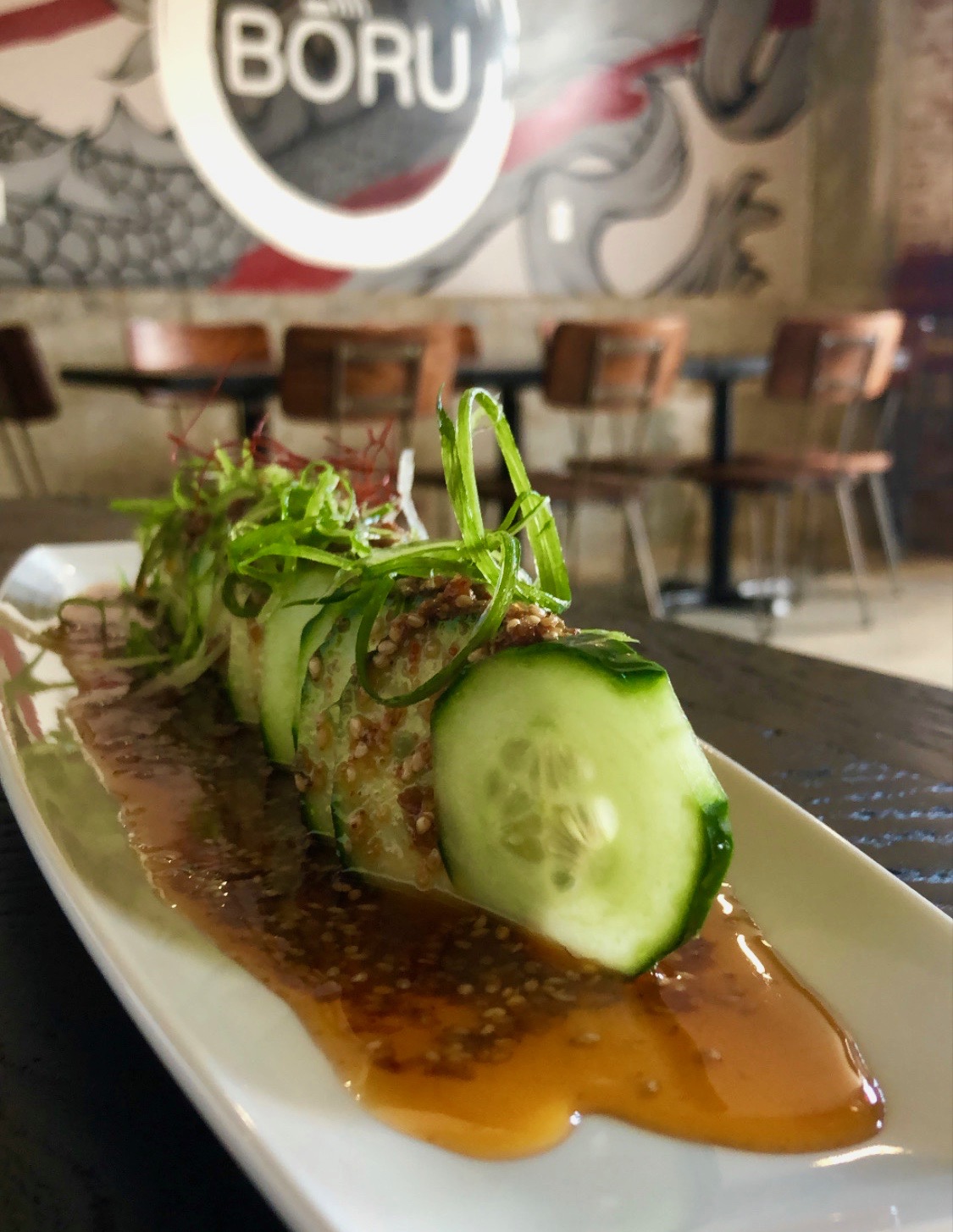 In the middle of Bōru Ramen‘s new space in Electric Depot, a glass room sticks out from the restaurant’s freshly painted Marc Fresh Art mural that spans the length of its back wall. While it currently sits vacant, in a few weeks, upon the restaurant’s grand opening, the small space will come to life, as fresh noodles are crafted in front of eager diners’ eyes.