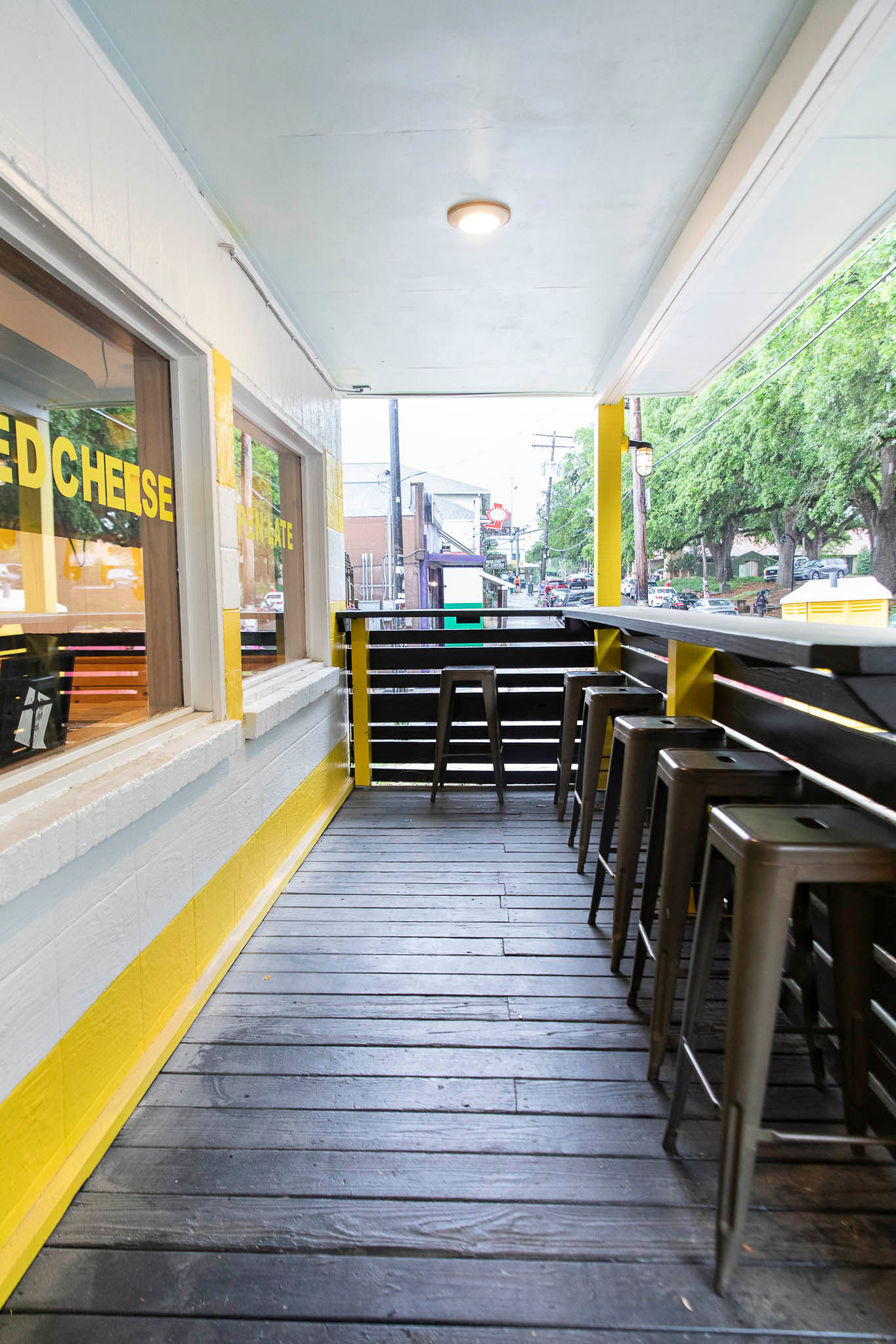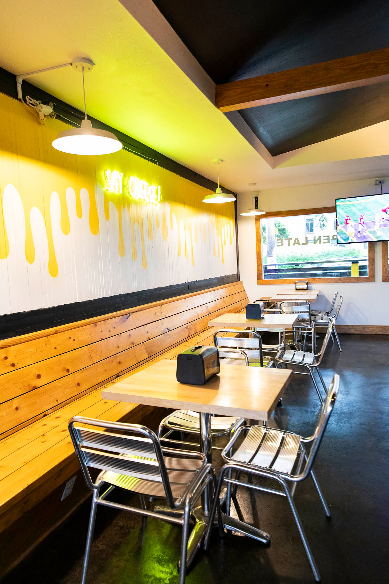 The new restaurant has a relaxed vibe with enough room to seat up to 56 patrons with indoor and outdoor tables. Inside, guests will see walls covered in cheese-yellow paint drips. Romancik commissioned two LSU students, Courtney Cook and Skyler Hale, to create a mural of Mike the Tiger devouring one of Big Cheezy’s signature sandwiches as another decor highlight. A few flat-screen TVs hang on walls to display menus, sports broadcasts and LSU highlights.