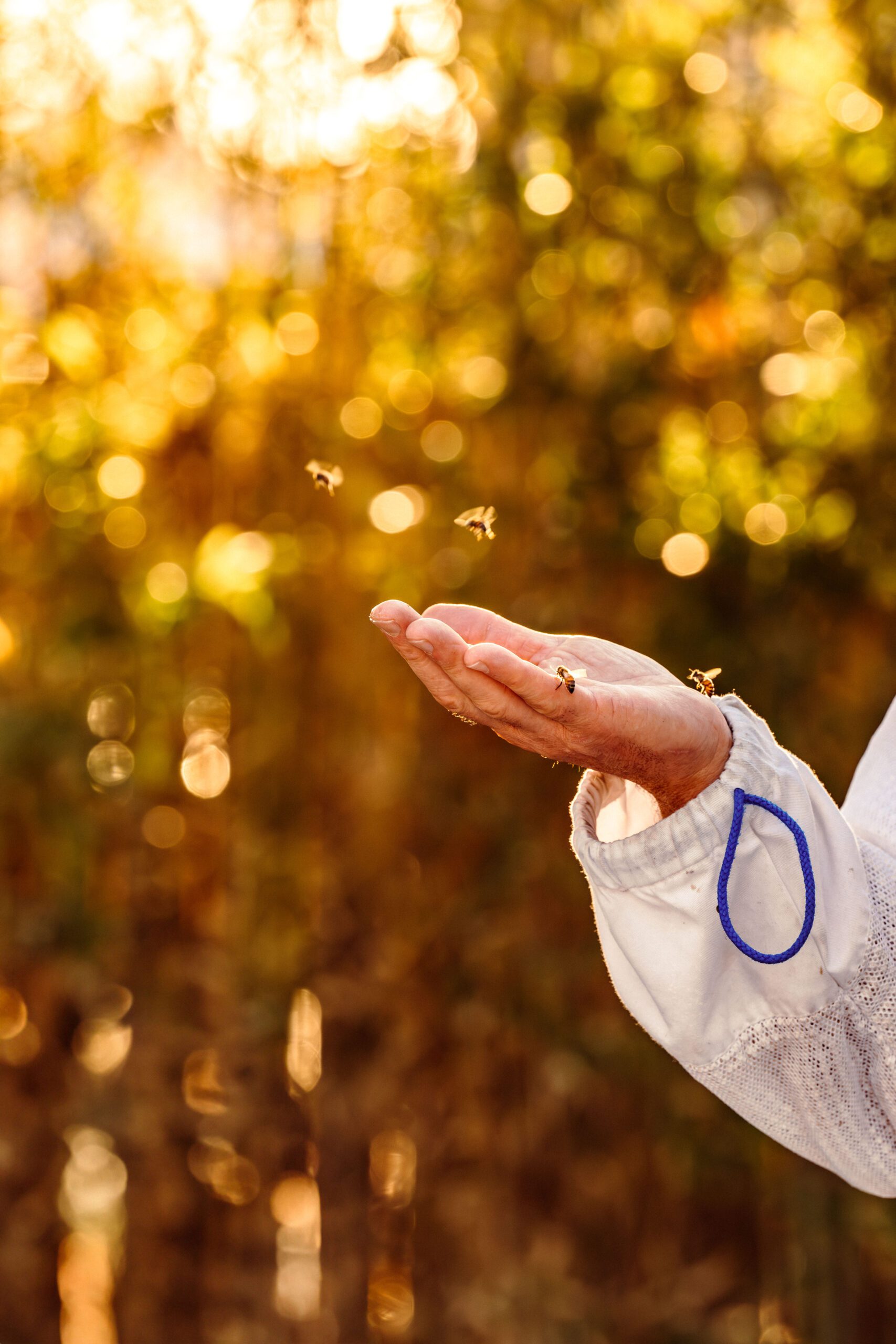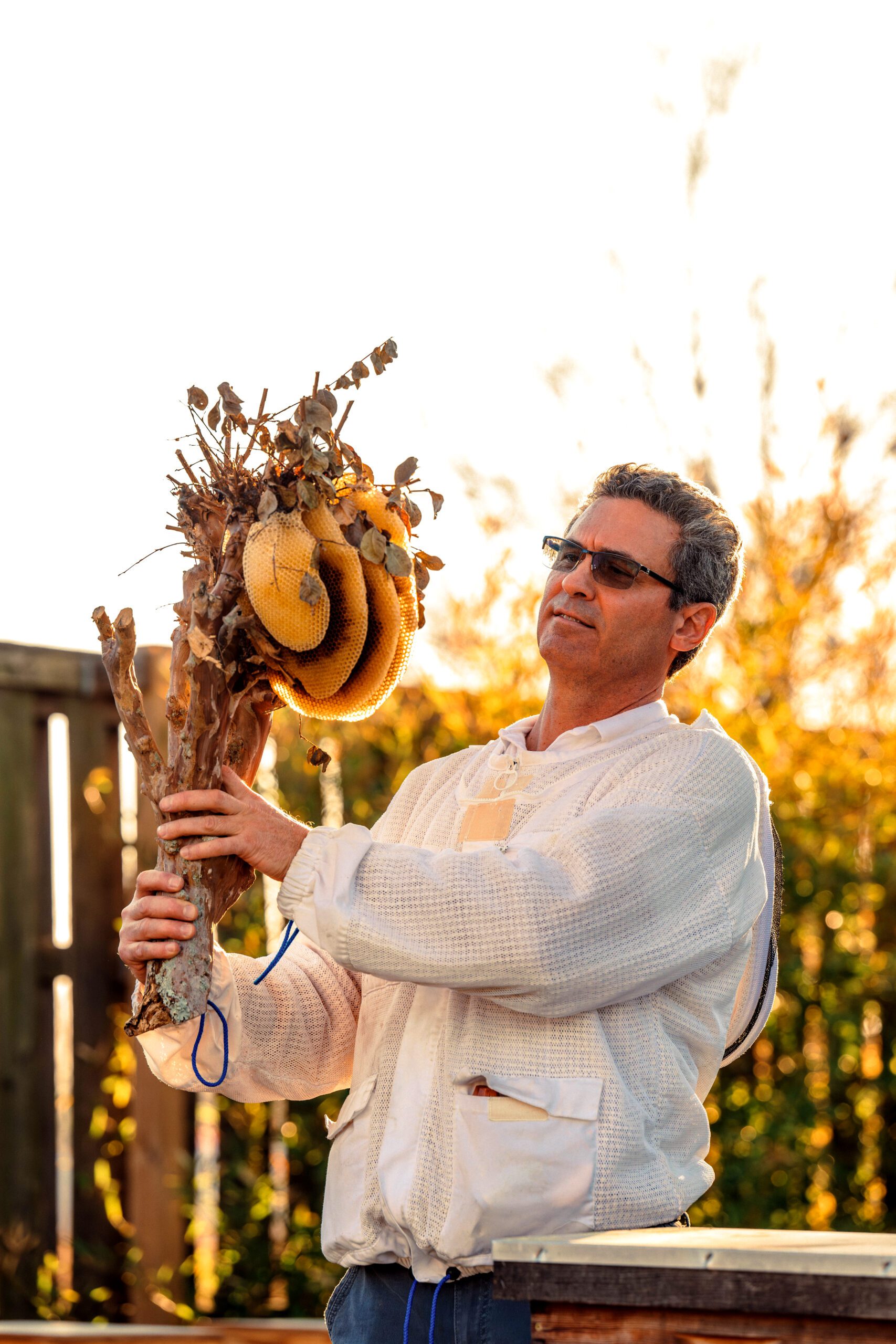 At the time, he was the global chairman of a worldwide organization. While in Geneva giving a presentation about economic development in developing countries, his wife called to inform him that a swarm of bees now called their back door home, and he advised her to call a pest control company. He winces, recalling seeing the powdered pesticides all over the door where their triplets, who were toddlers at the time, often crawled. Right there, with the economic impact of bees fresh in his mind, he silently vowed to learn all he could and help anyone who needed assistance relocating bees. Six months later, a swarm arrived in a tree next door, and he officially became a beekeeper.