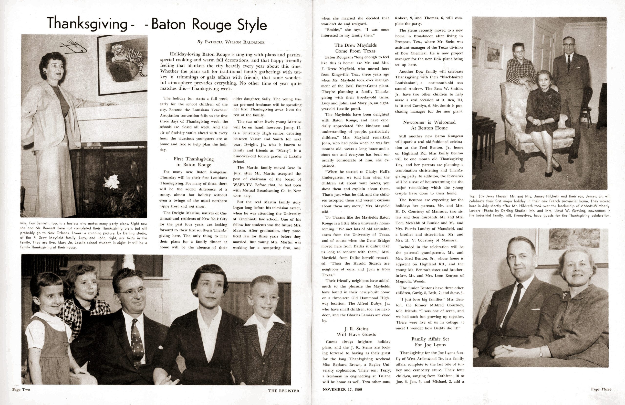 In “Thanksgiving Baton Rouge Style” featured in the November 1956 edition of The Register, writer Patricia Wilson Baldridge begins: “Holiday-loving Baton Rouge is tingling with plans and parties, special cooking and fall decorations, and that happy friendly feeling that blankets the city heavily every year about this time.” Nearly 70 years have passed, yet that same air returns every November.