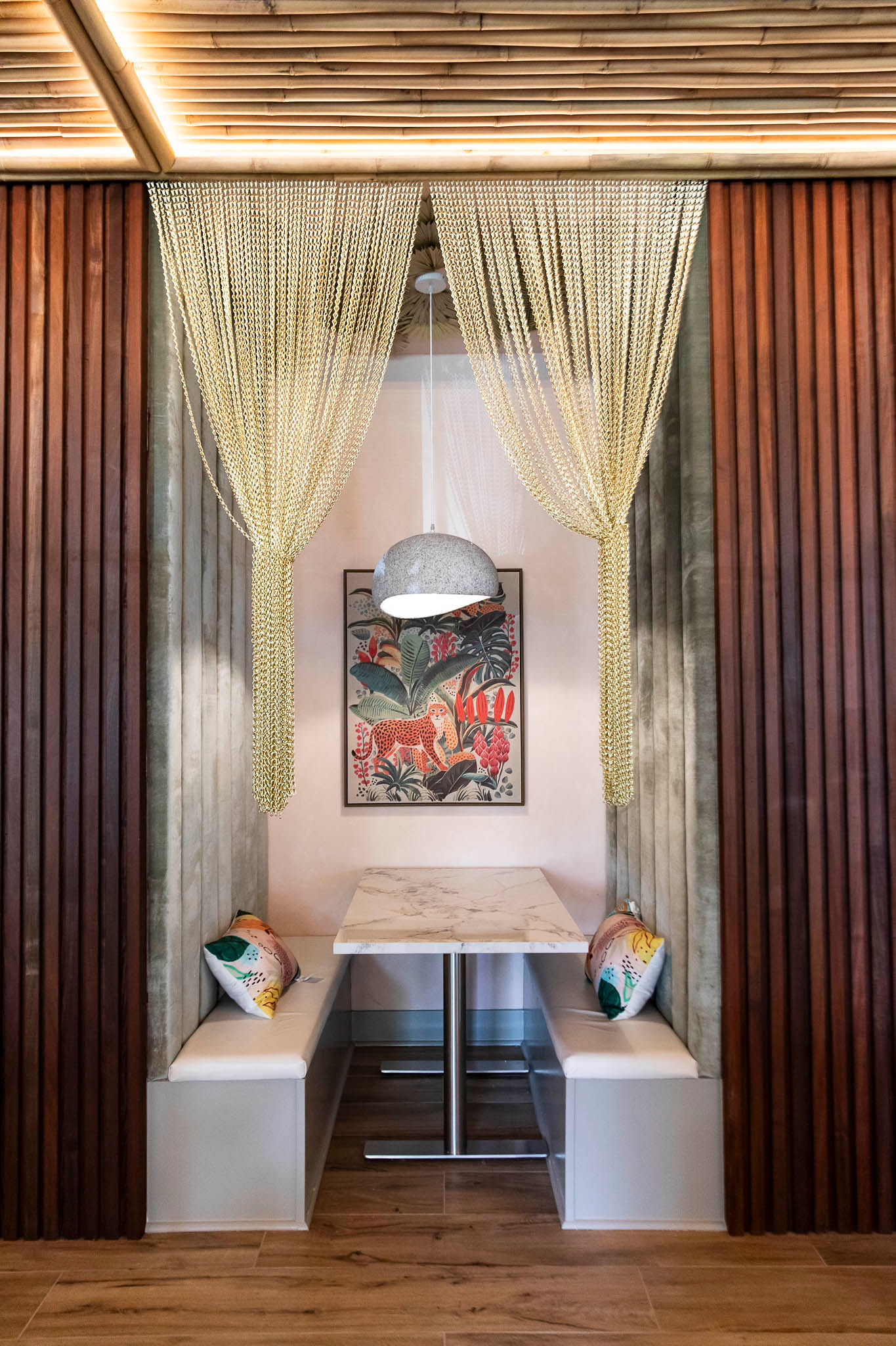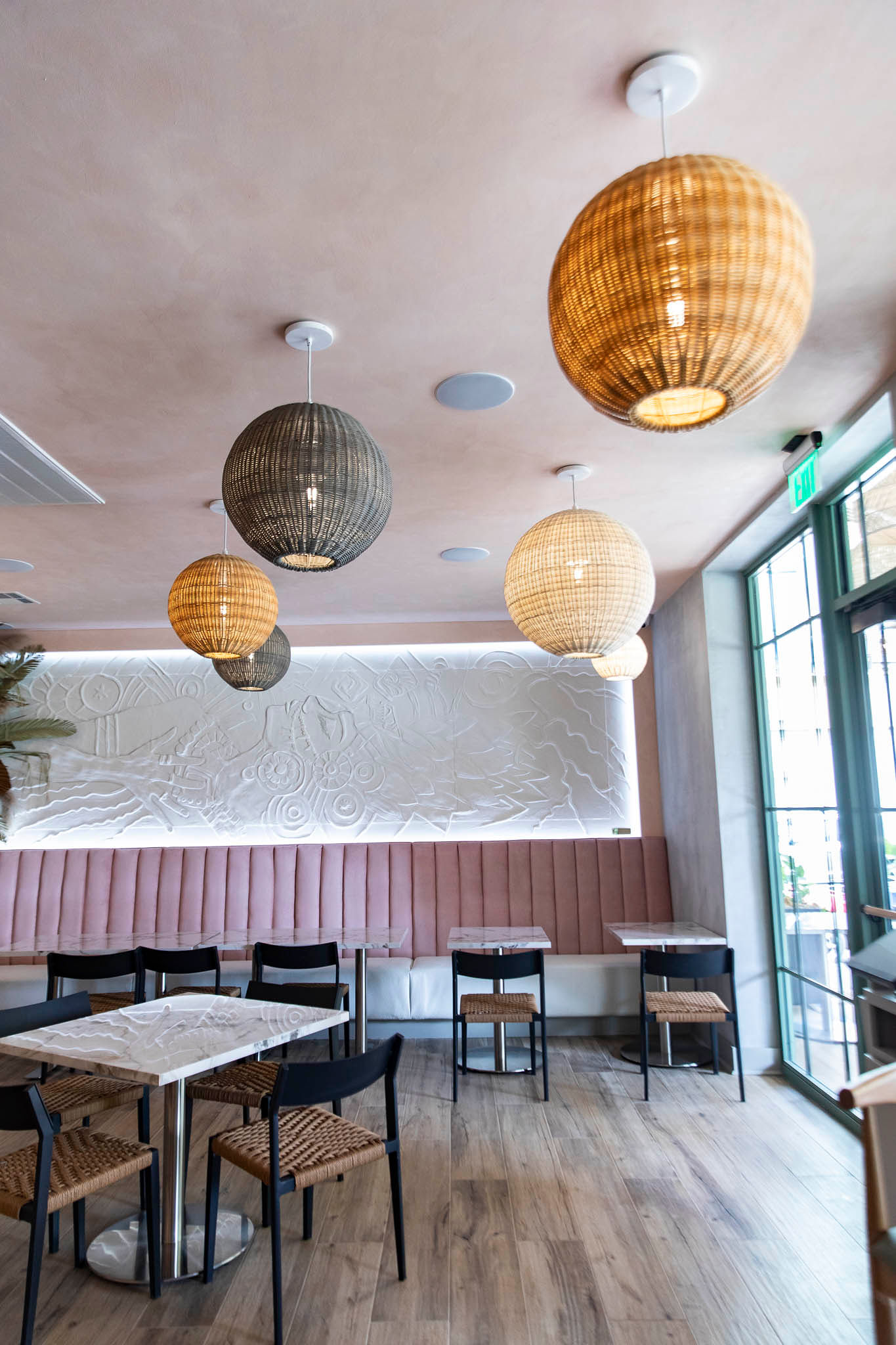 At the bar, a tiger figure is the centerpiece of a mirrored wall, a nod to Baton Rouge. Be sure to look up—slithering, hand-placed stones in the shape of a snake decorate the ceiling. Bartenders will shake up hand-crafted cocktails, like the Pork Decision, a tropical beverage served in a pink terracotta glass shaped like a piglet.