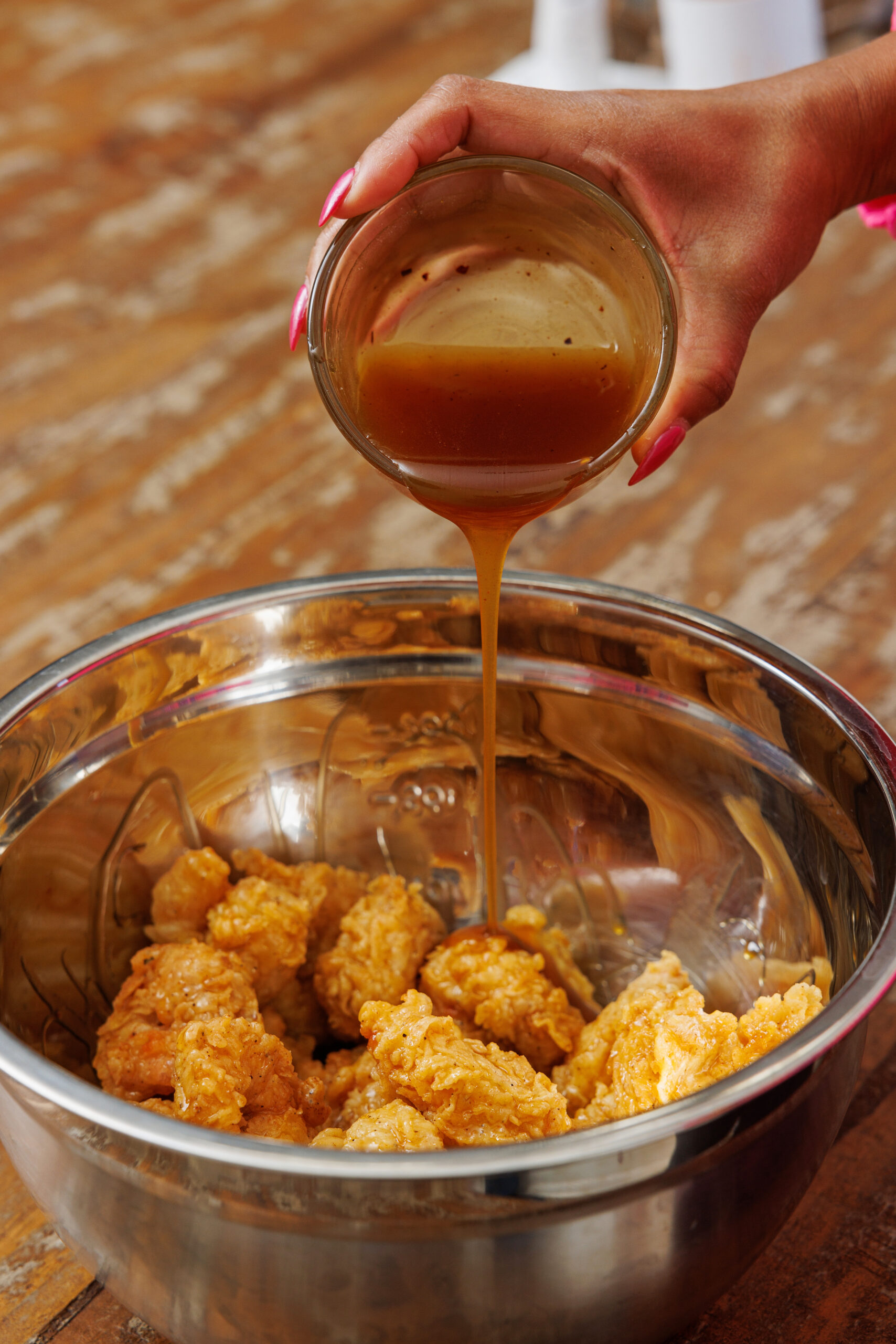 In a small saucepan, over medium-low heat, melt butter. Whisk in hot sauce, honey and sesame oil. Bring to a simmer (do not let it boil). Reduce heat to low and keep warm until ready to use.