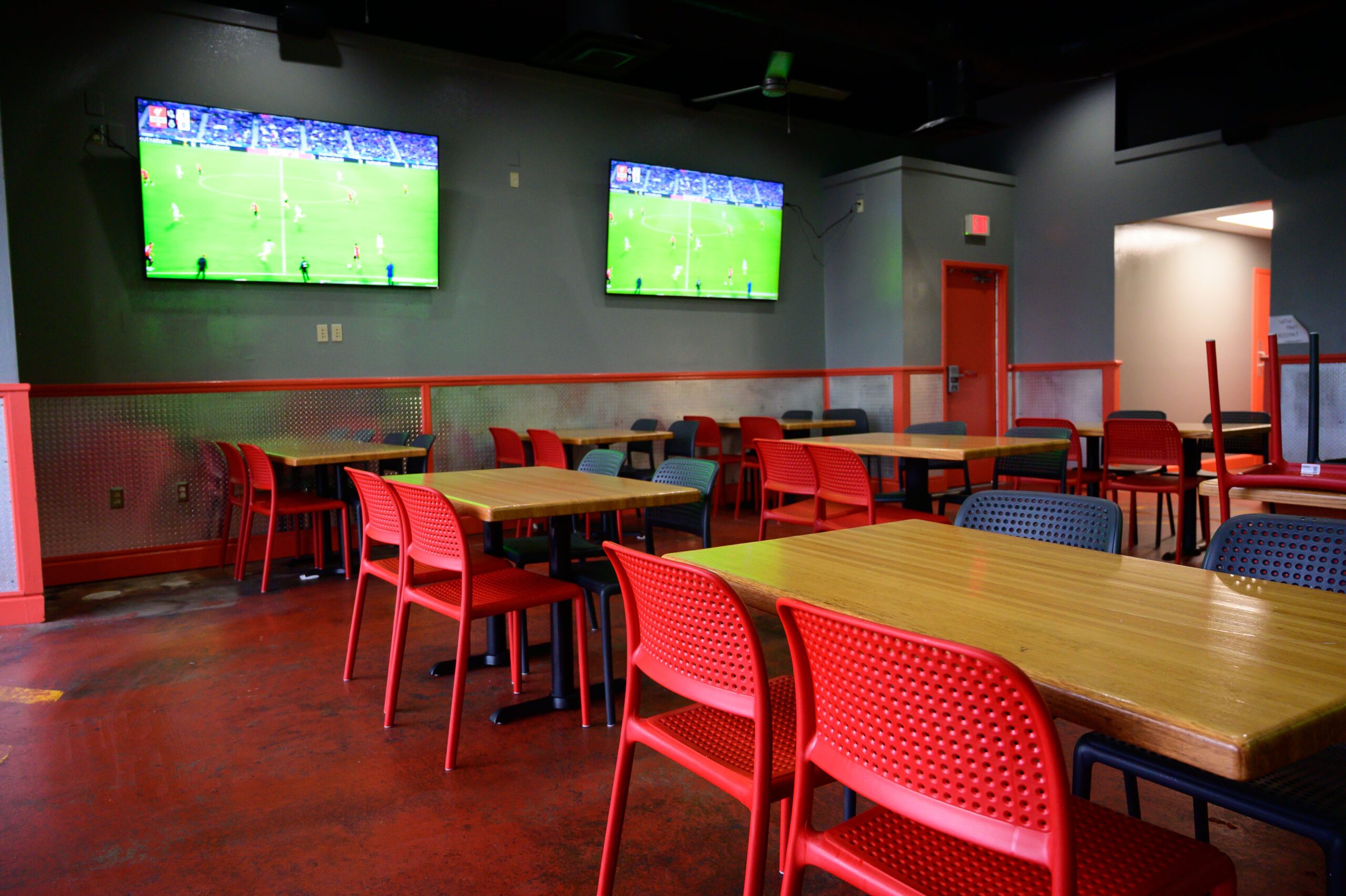 Those familiar with the original City Slice will know its signature red and black color scheme, which has traveled to the new spot. Dispenza says they’re still waiting on vinyl wraps for the bar and outdoor signage. With 20 TVs and a beefed-up sound system spread throughout the two dining rooms, the team is ready for weekends packed with big college football matchups.