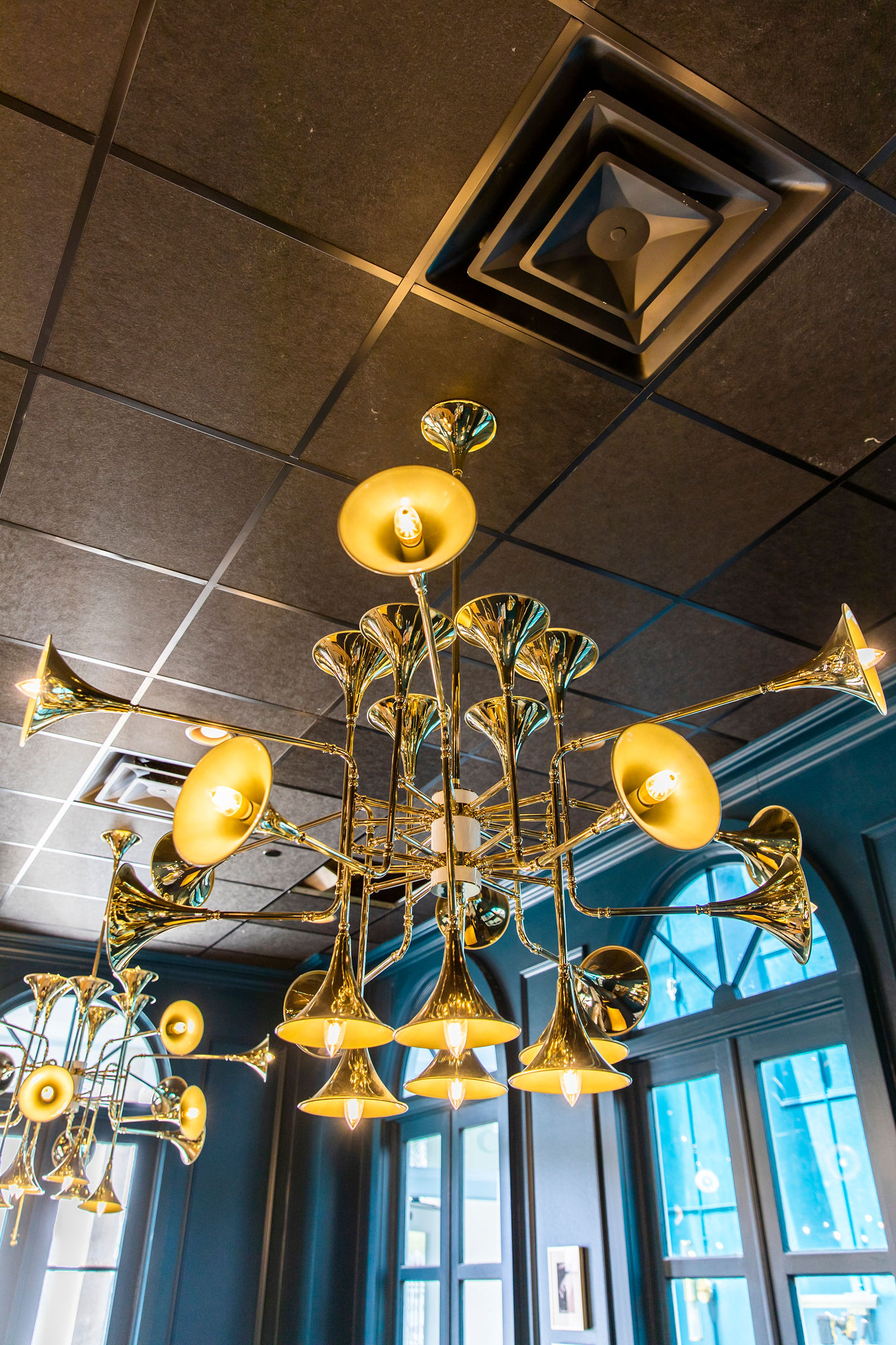 Throughout the nine-room establishment that can hold up to 400 people, each room has its own theme that embraces both Baton Rouge and Louisiana culture. “The Hallelujah Bar, Domino Room and Armstrong Room pay tribute to Louisiana’s jazz heritage and legends,” says Bartlett. Some of those design inspirations can be seen in the unique and eye-catching trumpet chandelier piece and in the music notes sprawled on the dark blue walls that play out Louis Armstrong’s rendition of “When the Saints Go Marching In.”