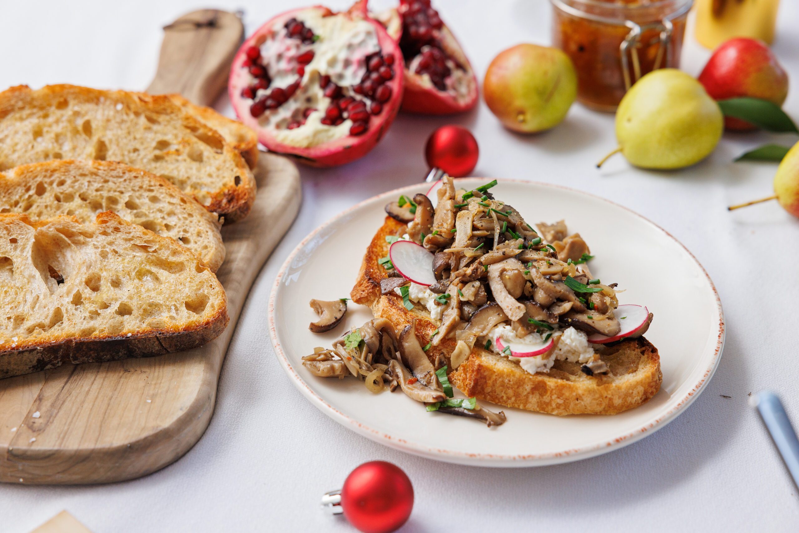 Combine ricotta with pepper and scoop about 2 Tbsp. onto each toast. Top each with a cascade of mushroom ragout and garnish to make it your own. Serve immediately.