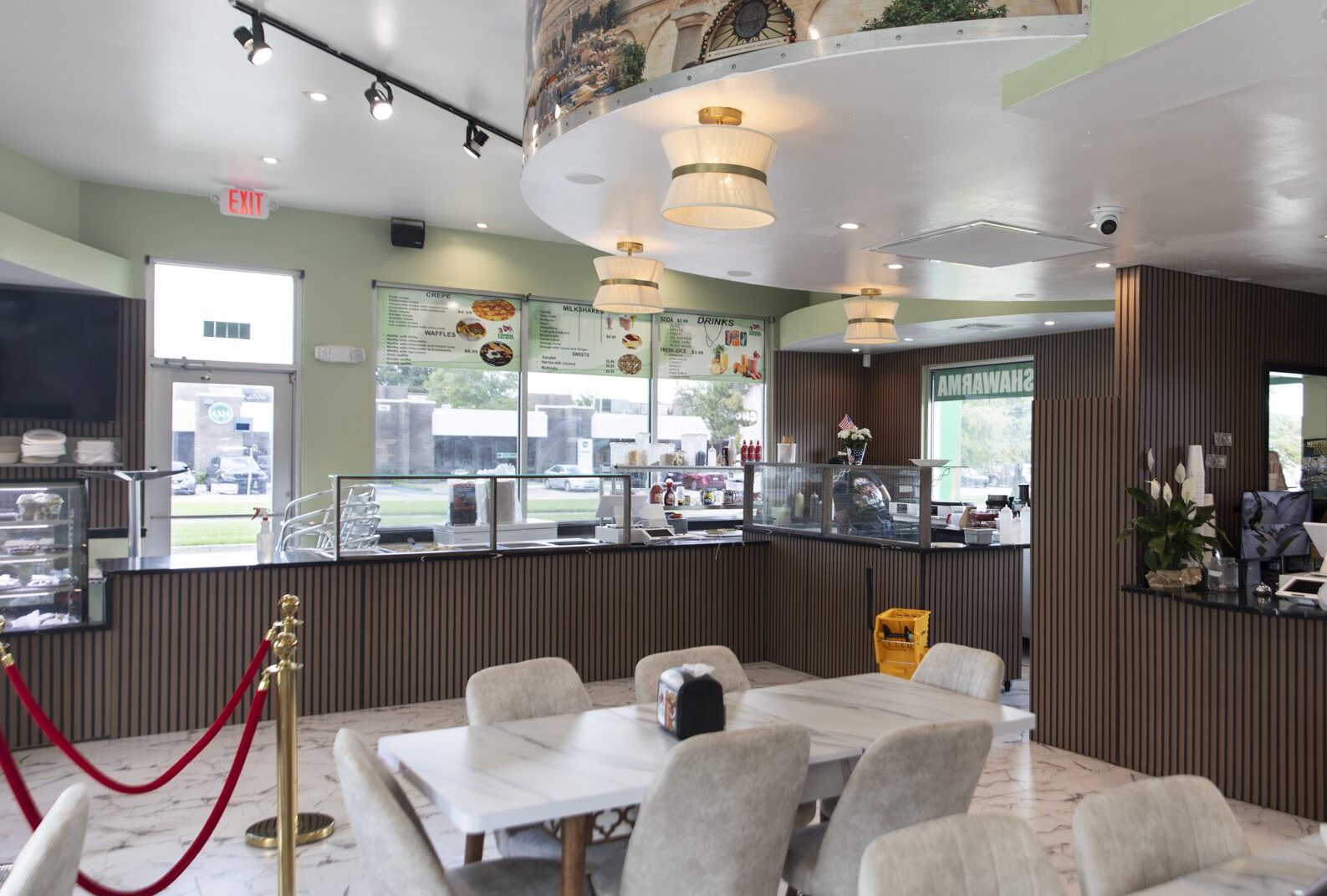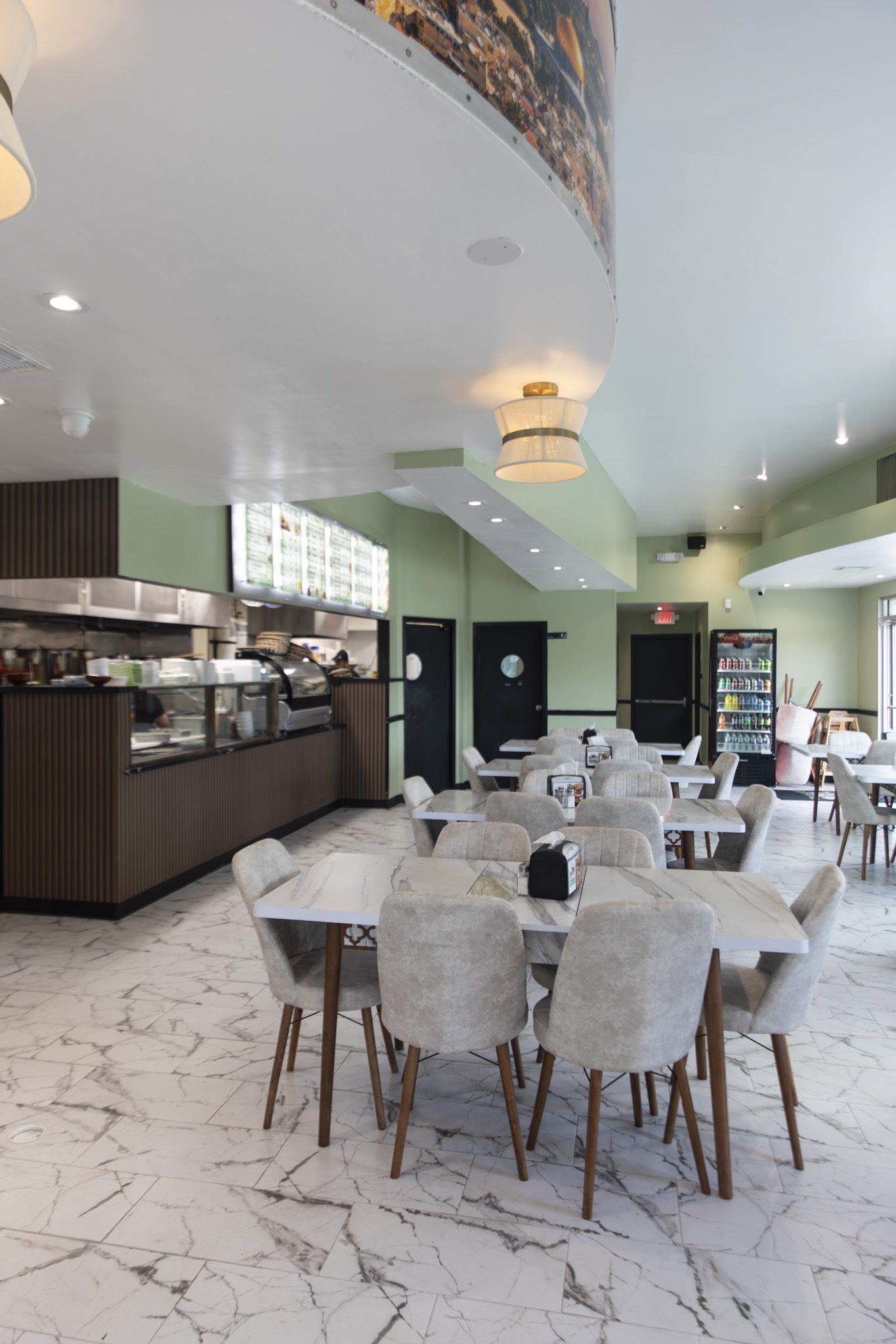 The interior of the fast-casual eatery is bright and cheerful, with cushioned seating, faux marble tables and flooring, and elevated murals of Jerusalem.