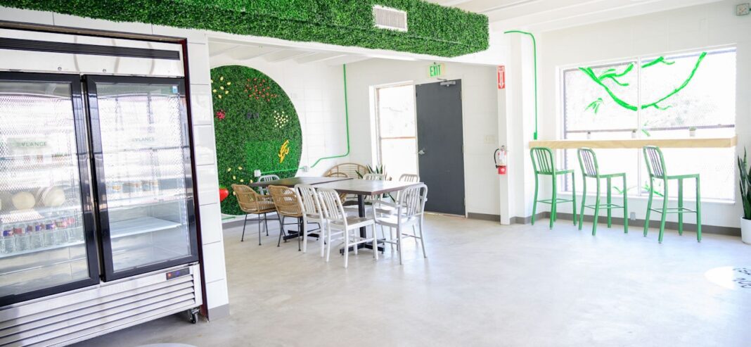 Off to one corner is the smoothie bar, decorated with wooden slats and plants to accent the all-natural food. The smoothie bar contains various fruits and add-ons to create custom smoothies and acai bowls. Featuring the usual suspects like granola, strawberry, banana and coconut, the selection will also have seasonal fruits like mangos and additional items like hemp, chia seeds and bee pollen for an additional health boost.