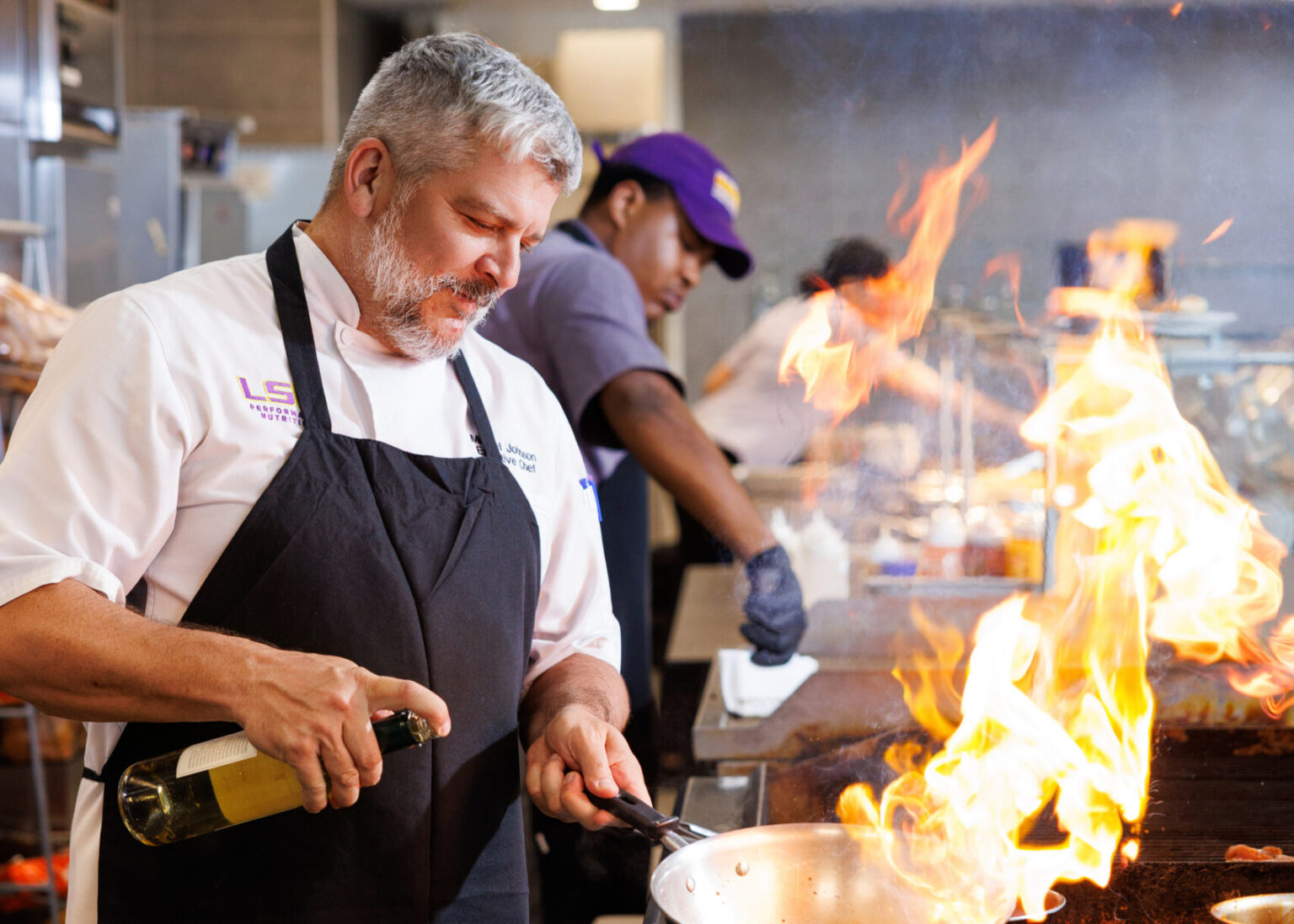 LSU brought Johnson on board when the center debuted. On an average day, find him making his rounds at the dining hall’s serving stations.