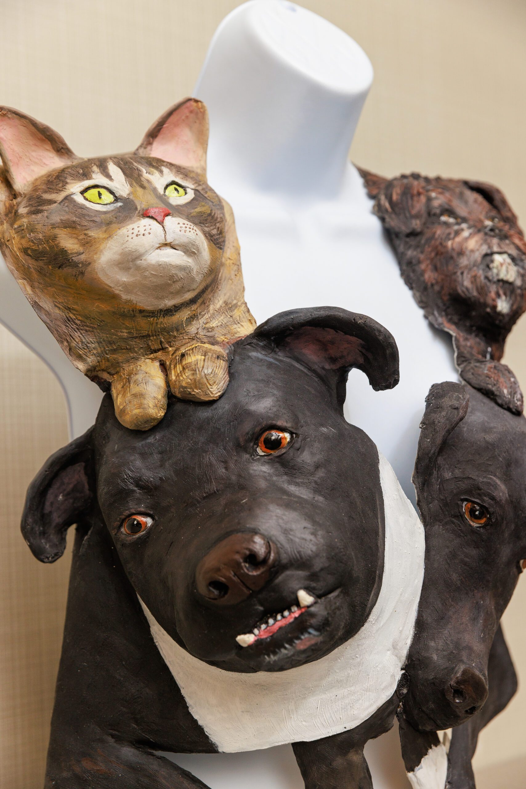 Last fall, she created a wearable bra with sculptures of cancer survivor Laurie Lynn Drummond’s rescued animals for the event.