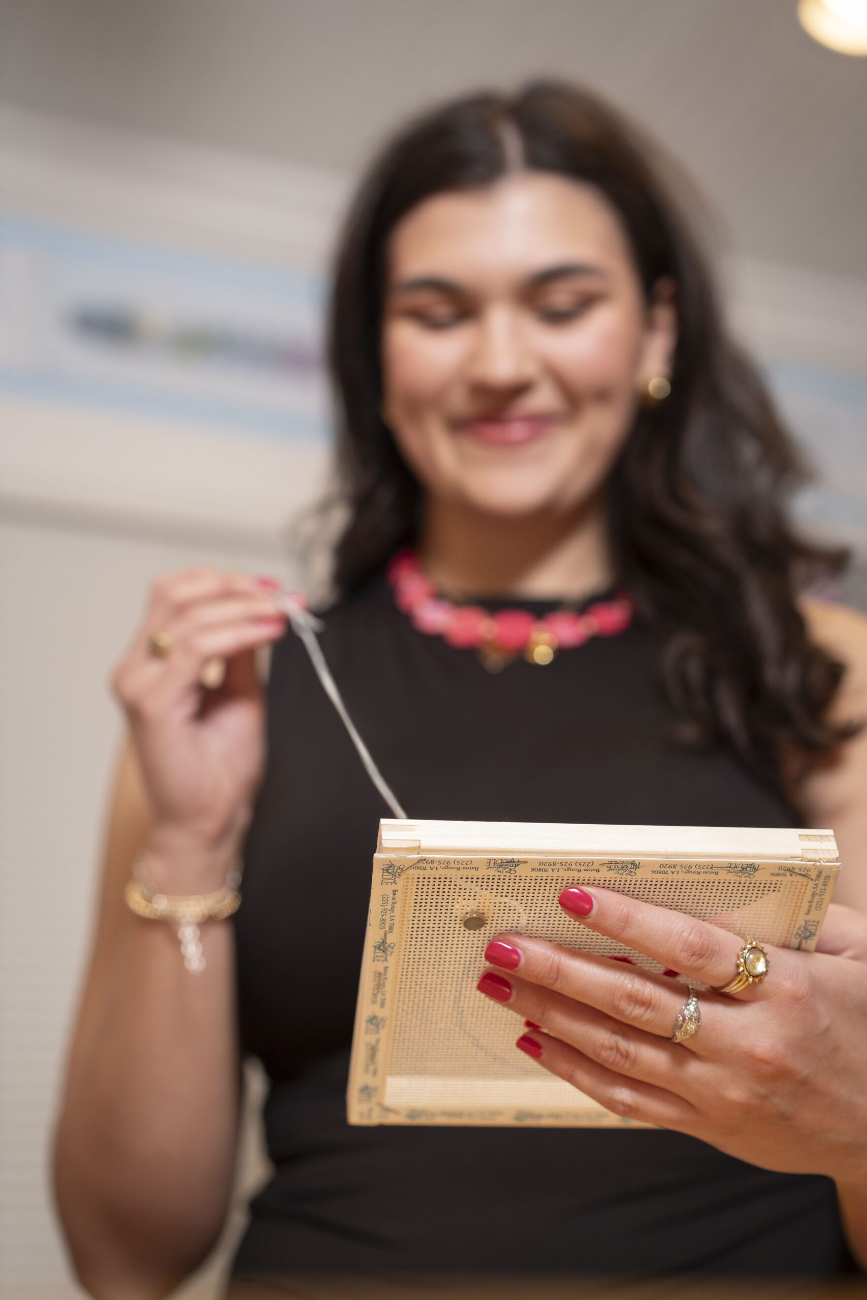 Like many hobbies, needlepoint is only made better with company. “It’s relaxing, and you don’t need a lot of brain power unless you’re doing some crazy stitch, but with a basic stitch, it’s easy to unwind and hang out with friends,” Steilman says. “It’s not dinner and drinks. It’s something that’s a little bit more creative and offers a different way to bond. It’s been nice to help build our community, see how strong it really is, and build up fellow creatives.”