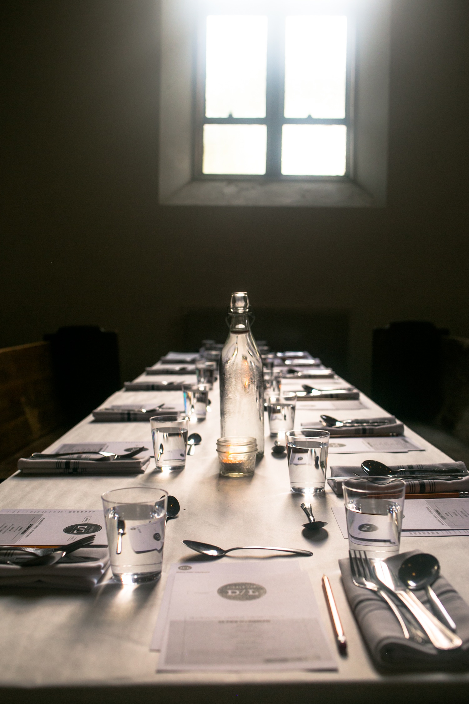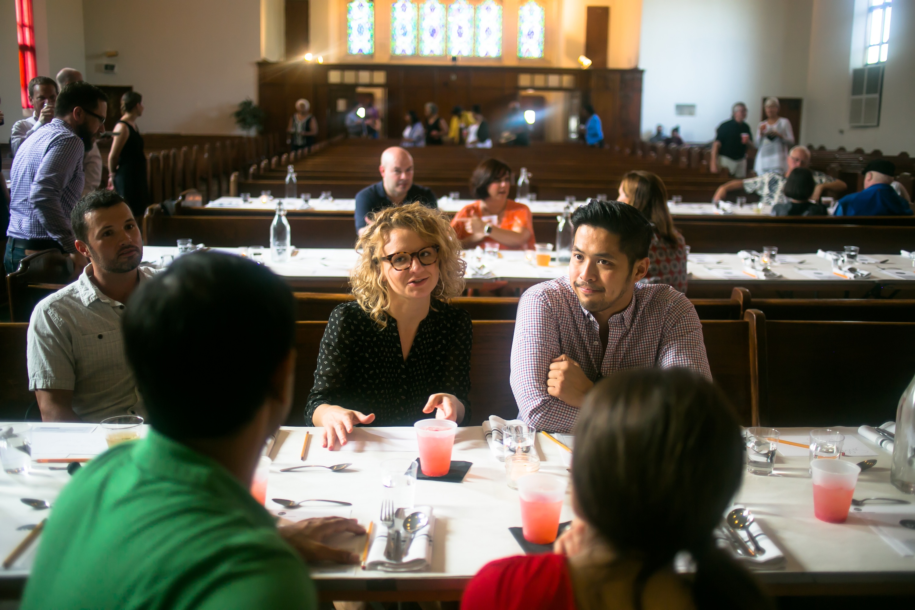 In the nave of the church, old oak pews were turned to face long tables. Camera phones flashed as guests stepped into to the surprisingly elegant venue, which featured massive stained-glass windows and an altar-turned-kitchen station. Some diners found seats with friends while others made new acquaintances. The long tables encouraged guests to taste and review, share and explore with those around them.