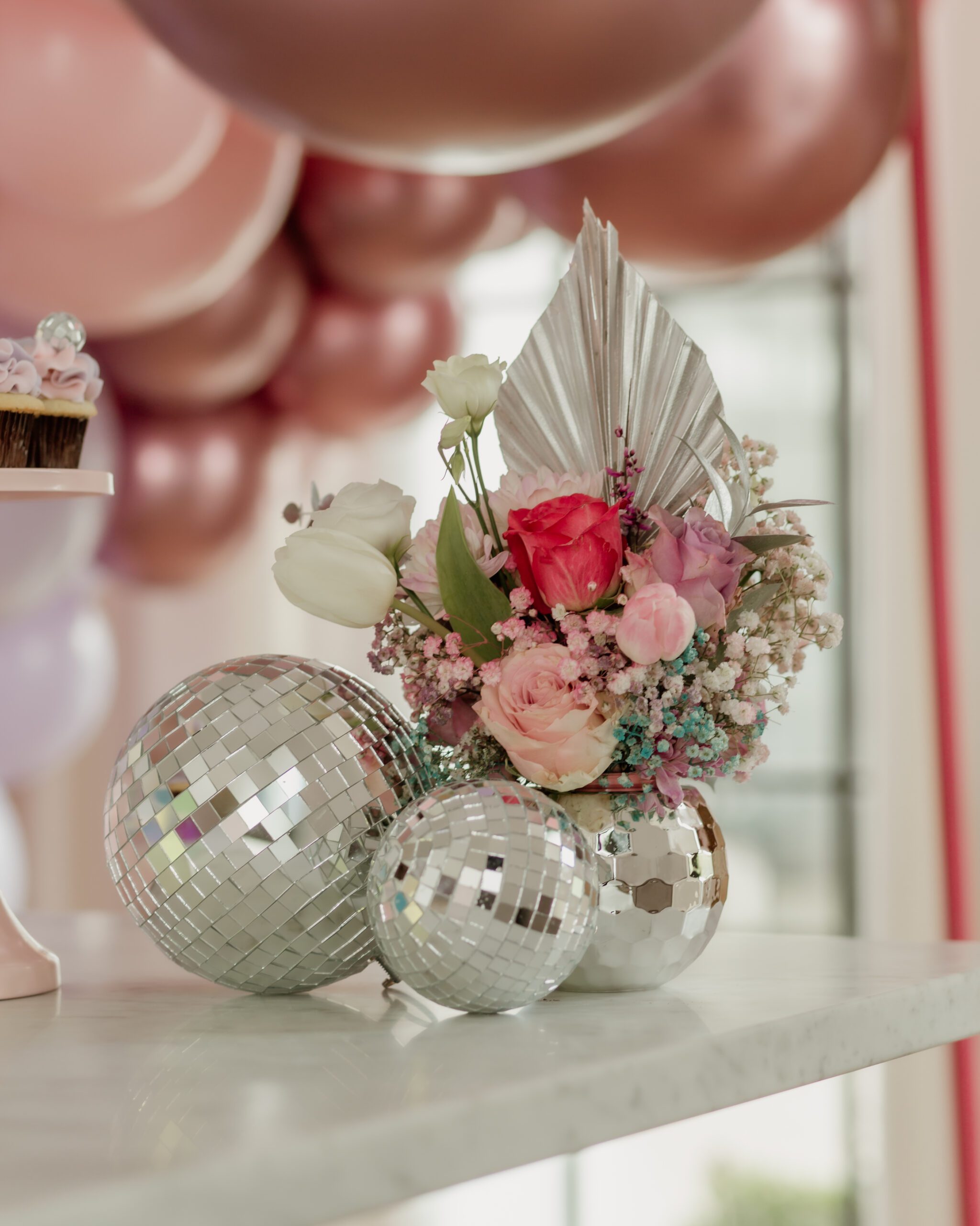 “All floral arrangements were designed in disco balls,” Bell says, “and we even placed real disco balls in the balloon design.”