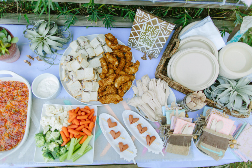 Young guests also gathered around a low table surrounding a fire pit, complete with custom-made pillows for seating, to make their own necklaces and keychains. A nearby teepee housed a sand-art station that was a big hit for all. Guests young and old enjoyed the Cactus Café, which offered a build-your-own taco experience as well as hot-dog hearts, fresh veggies, and Kriger’s mom’s beloved pepper-jelly dip.