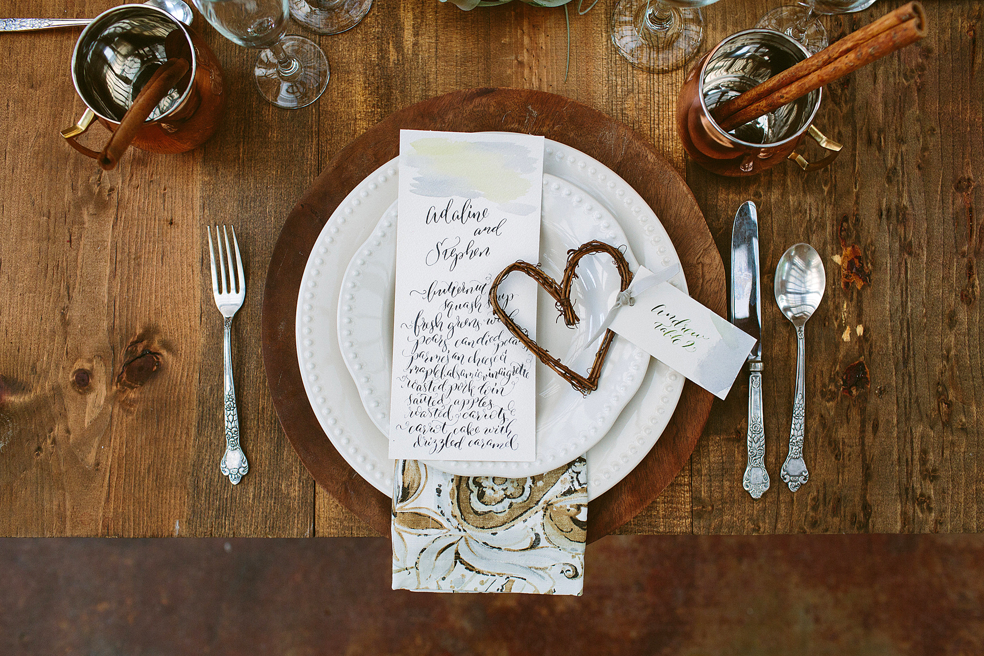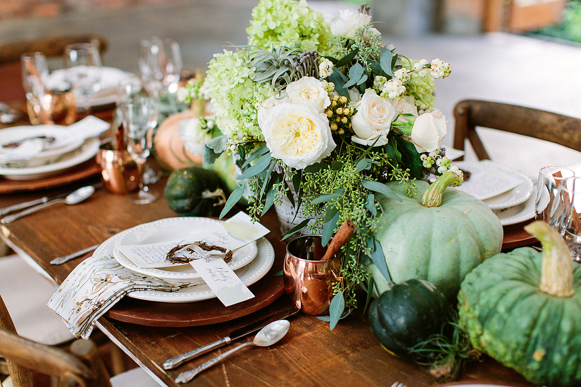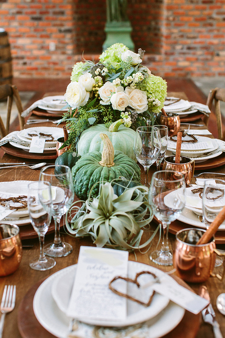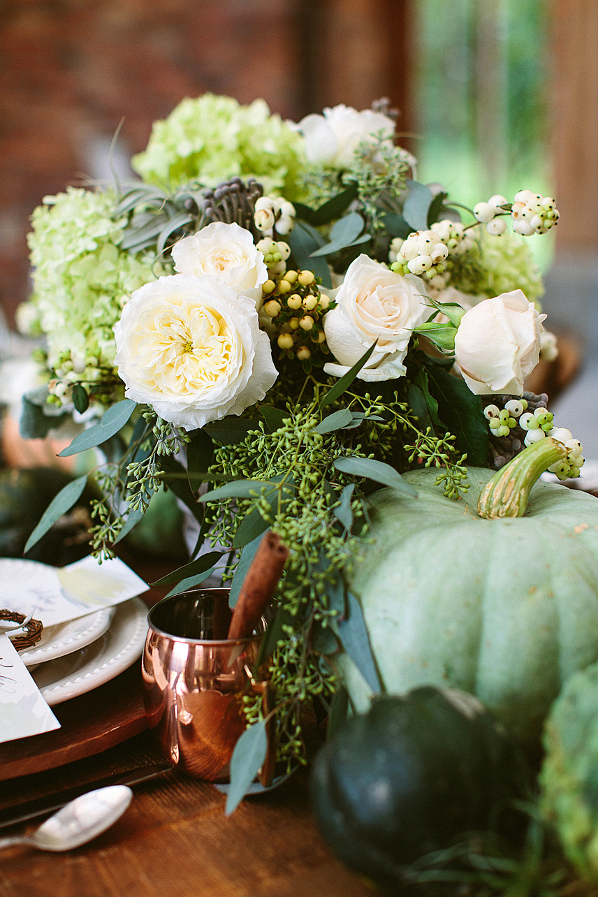 The crisp, cool days of fall call for sensational celebrations. Beautiful greens, grays and whites play a big role in this scene—forget the typical orange, red and yellow combinations. Simple and true hues from the outdoors can inspire any table setting. Pair with copper mugs, wooden chargers, antique bottles and pheasant feathers for a natural punch worthy of any indoor party.