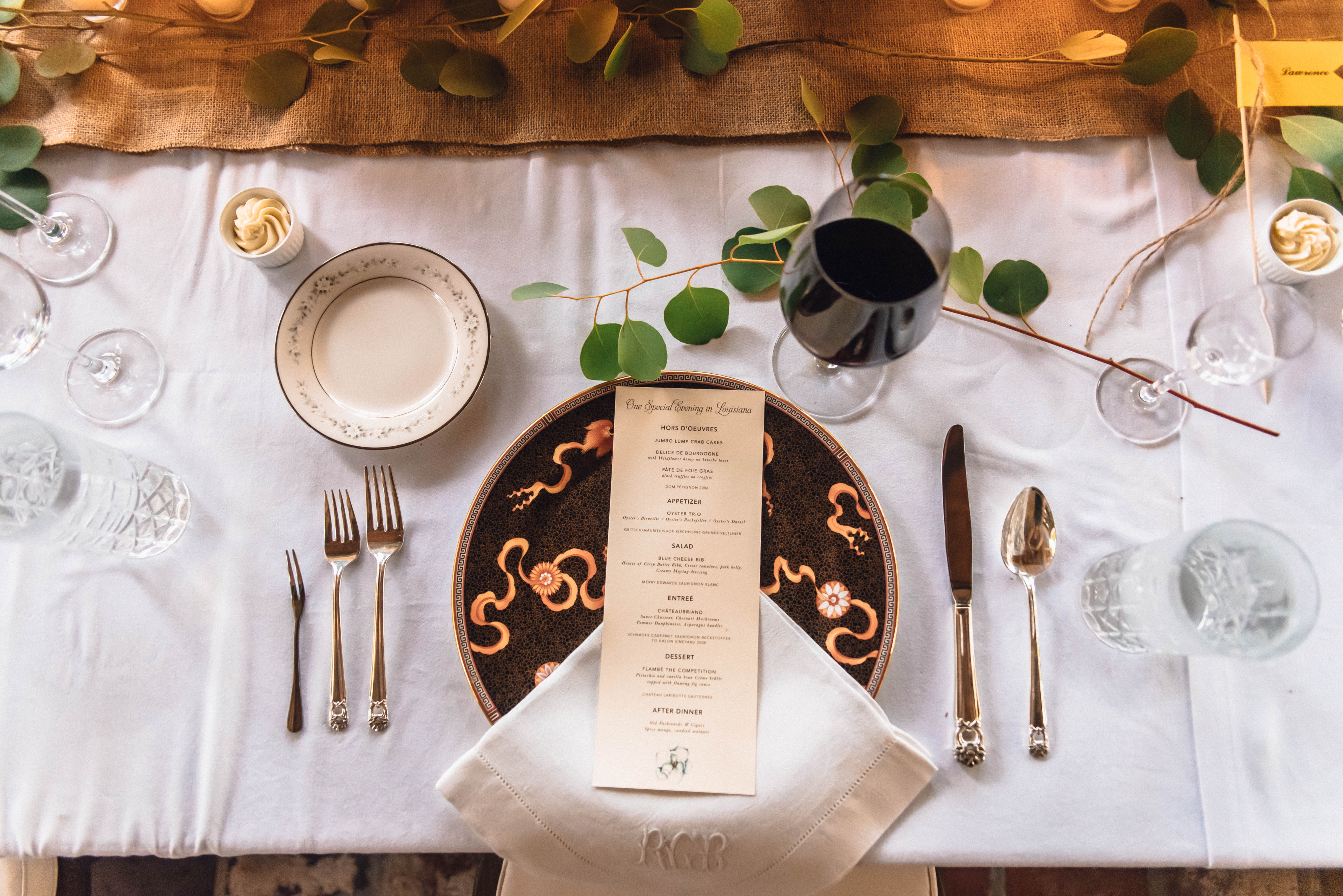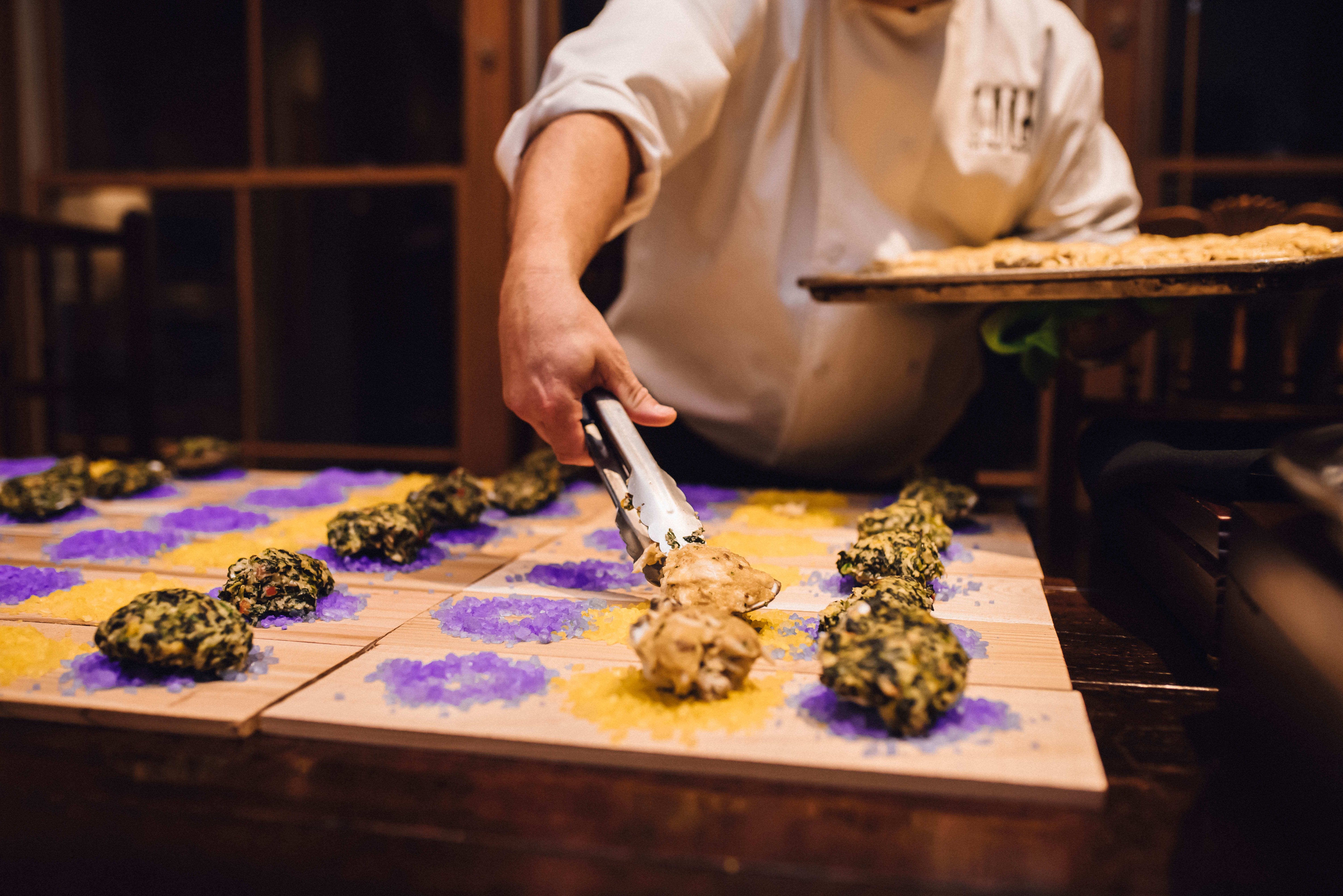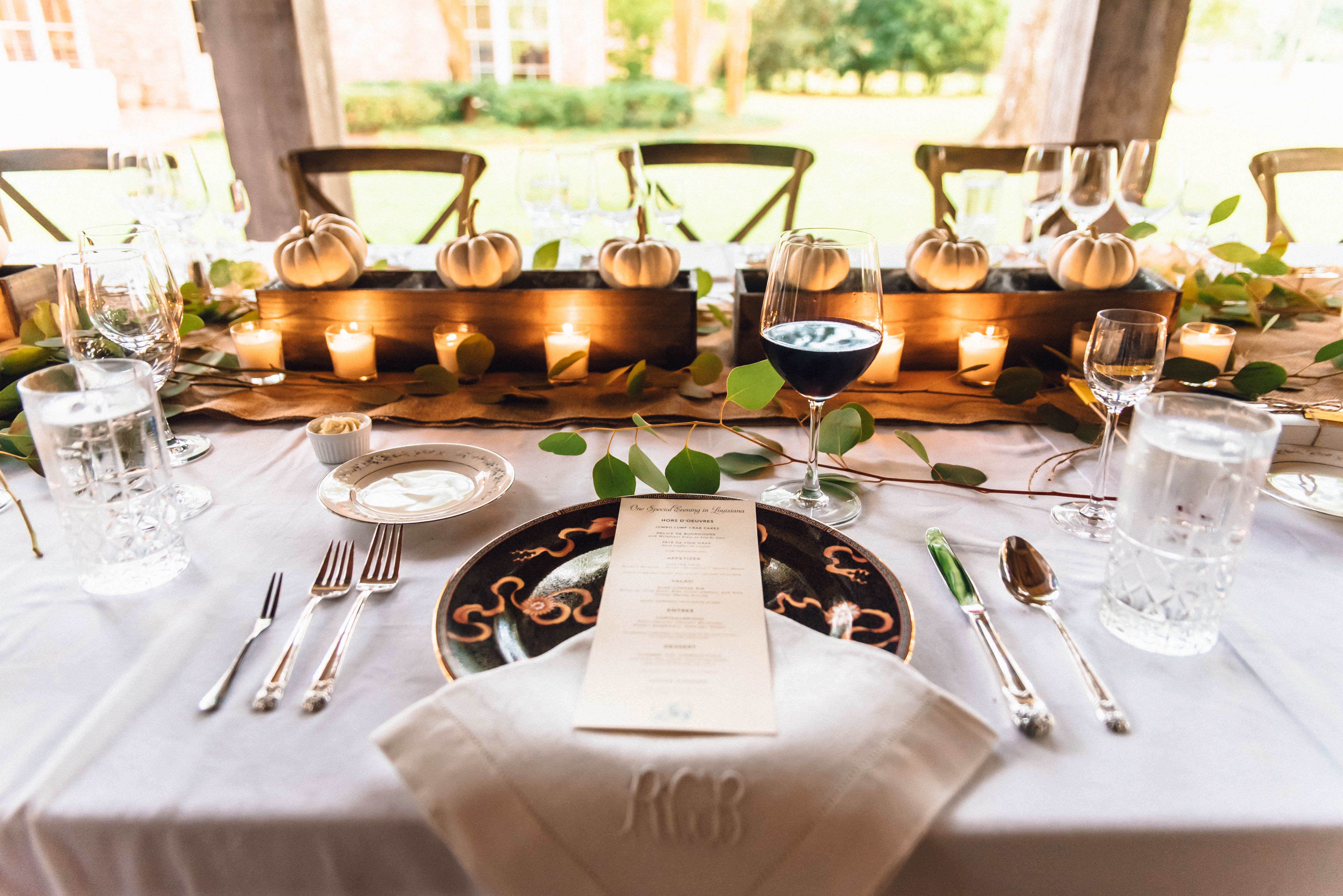 The pumpkins perched atop wooden boxes filled with dry ice, a creative centerpiece that produced a faint fog. A burlap runner stretched the length of the table, with fresh greenery woven throughout. But the natural elements on the table were not to suggest a simple, unrefined menu. Instead, guests dined on oysters prepared three ways, a blue cheese bibb salad, and chateaubriand with pommes dauphinoise and asparagus bundles. Dessert was a pistachio and vanilla bean crème brûlée topped with a flaming fig sauce.