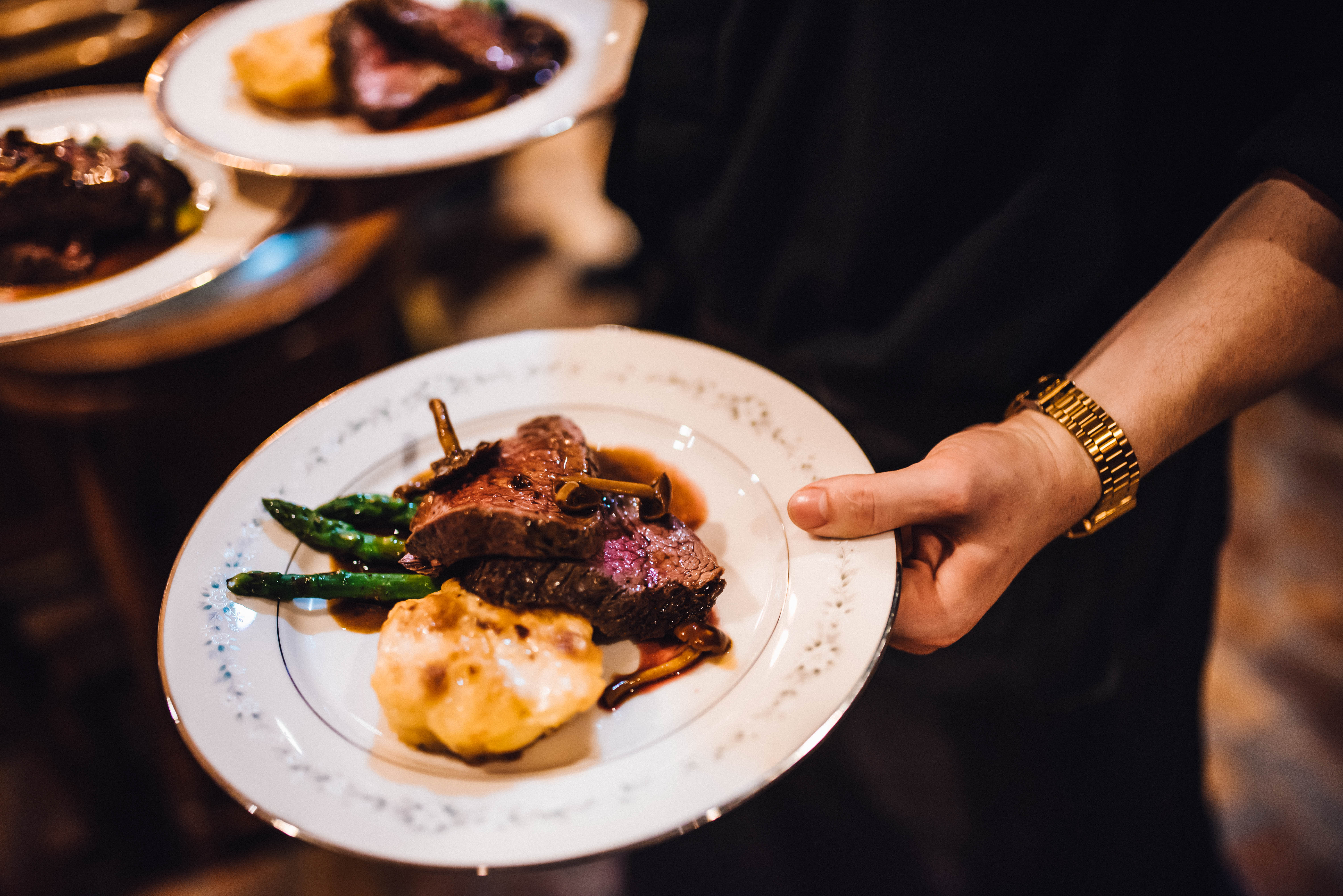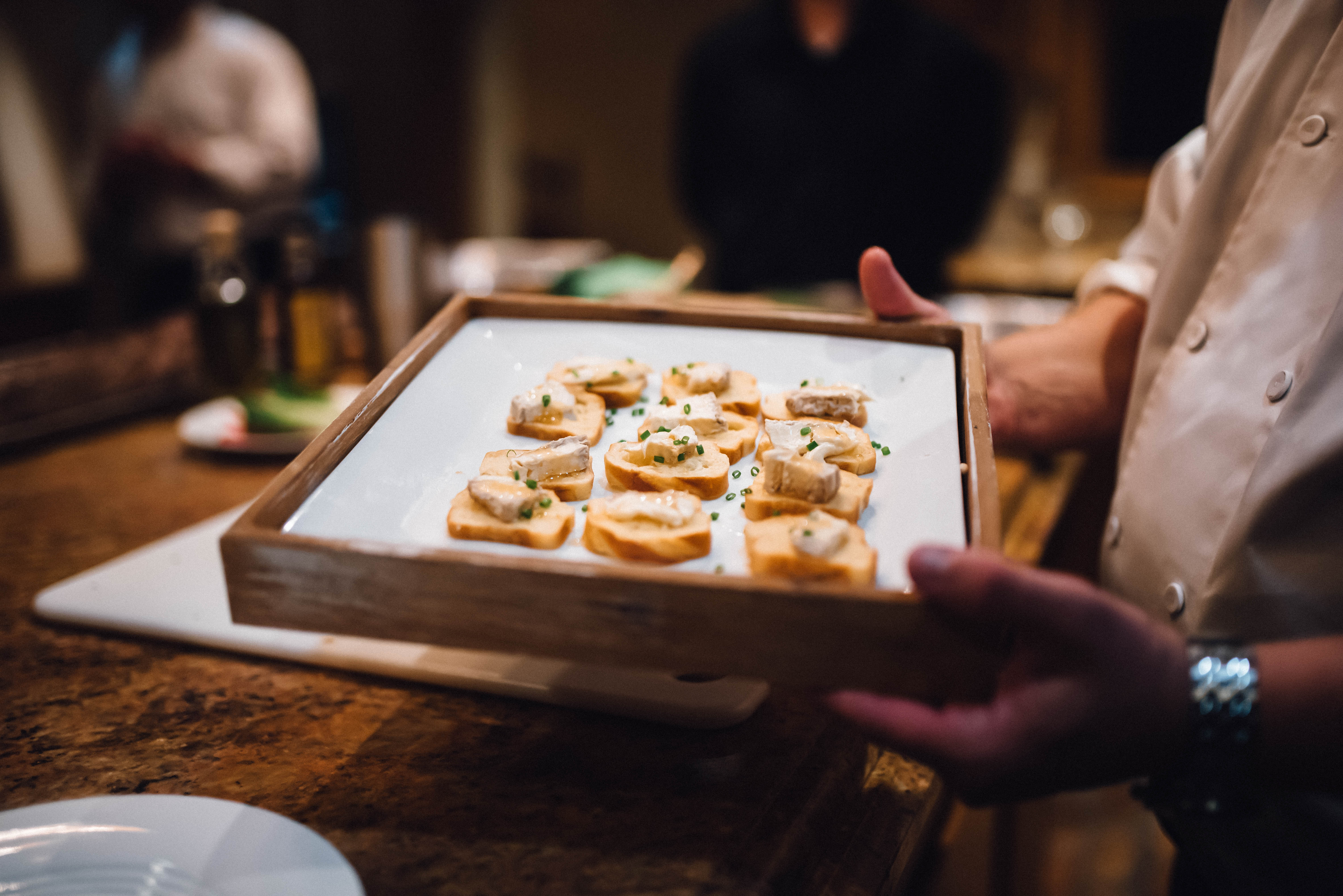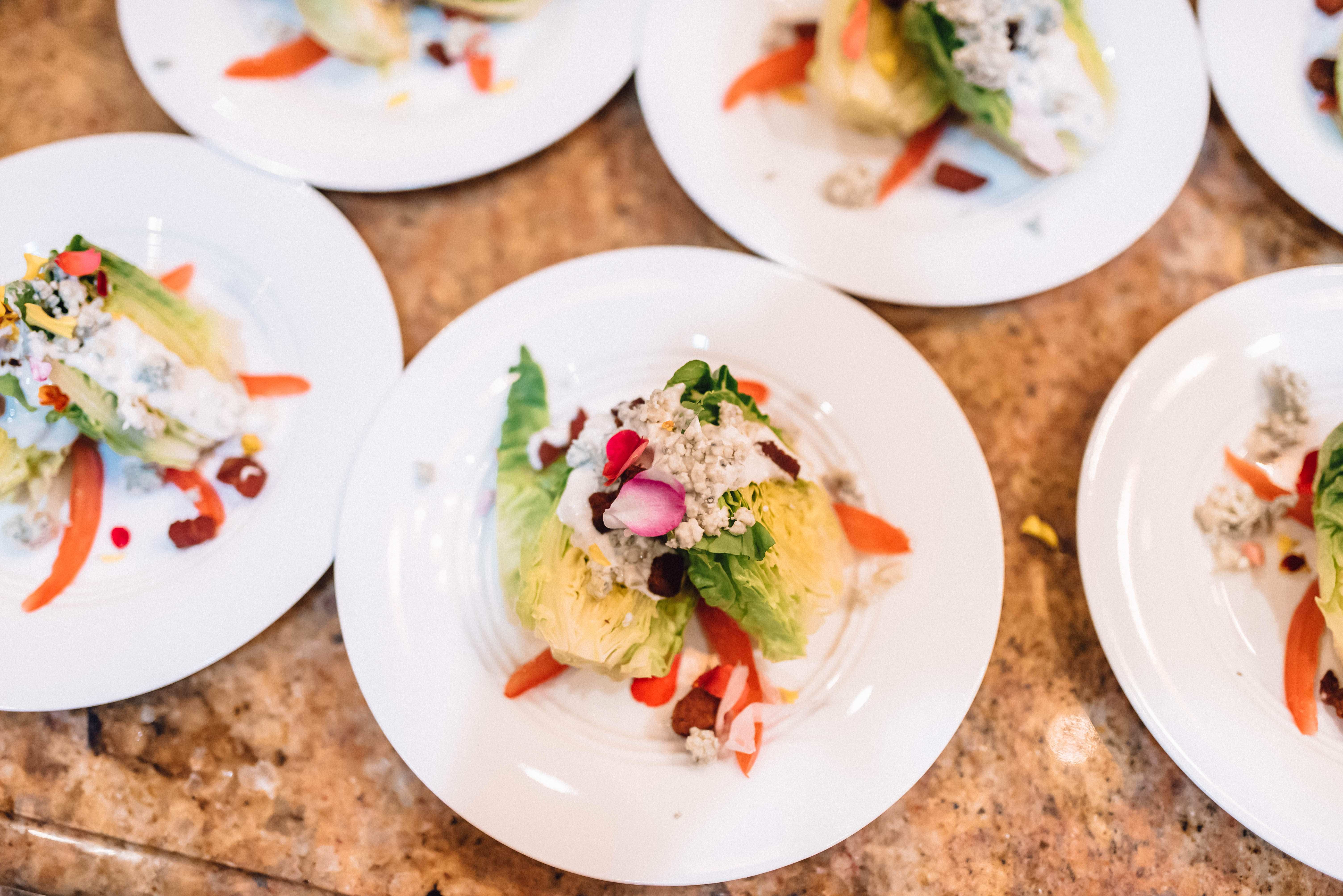 The pumpkins perched atop wooden boxes filled with dry ice, a creative centerpiece that produced a faint fog. A burlap runner stretched the length of the table, with fresh greenery woven throughout. But the natural elements on the table were not to suggest a simple, unrefined menu. Instead, guests dined on oysters prepared three ways, a blue cheese bibb salad, and chateaubriand with pommes dauphinoise and asparagus bundles. Dessert was a pistachio and vanilla bean crème brûlée topped with a flaming fig sauce.