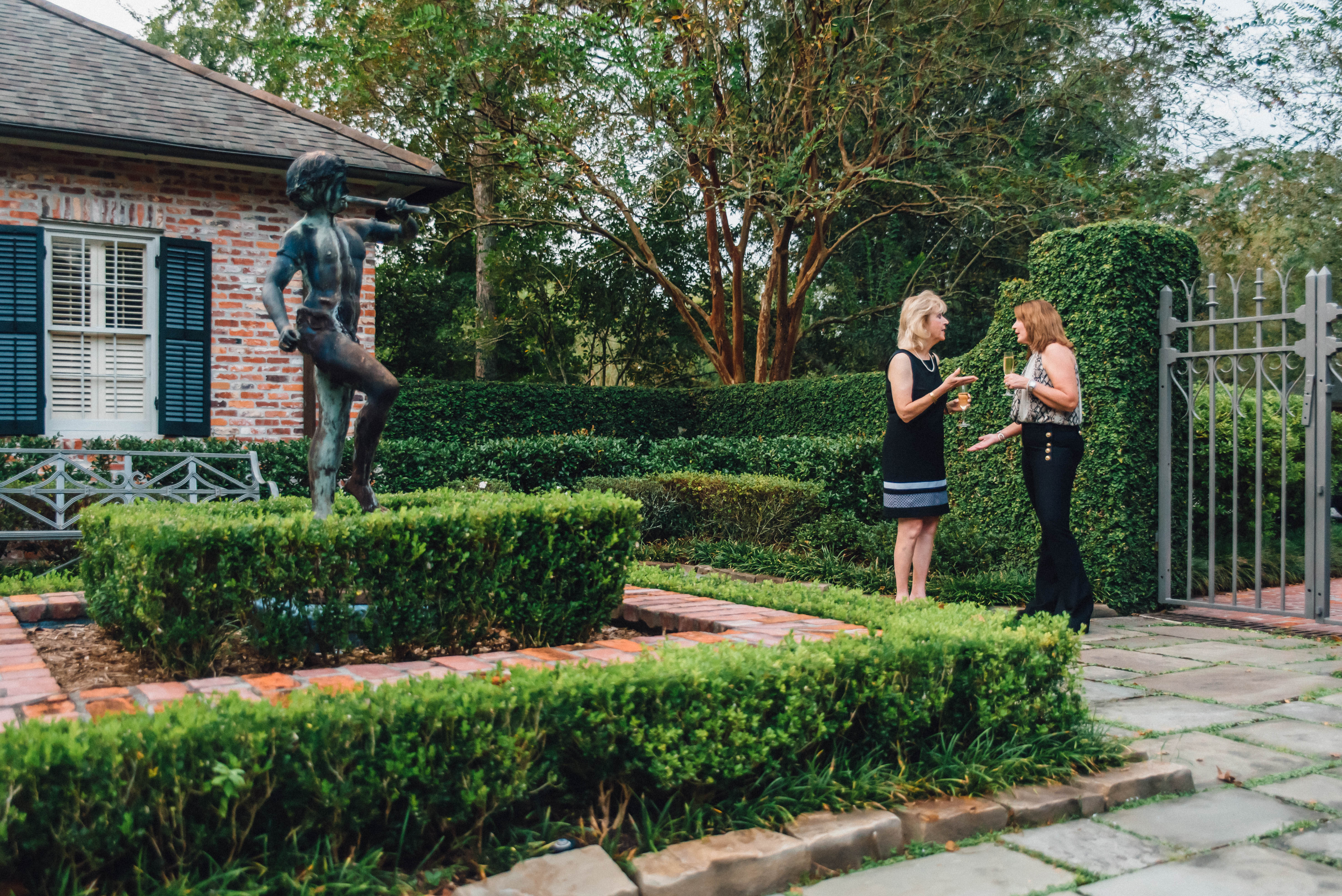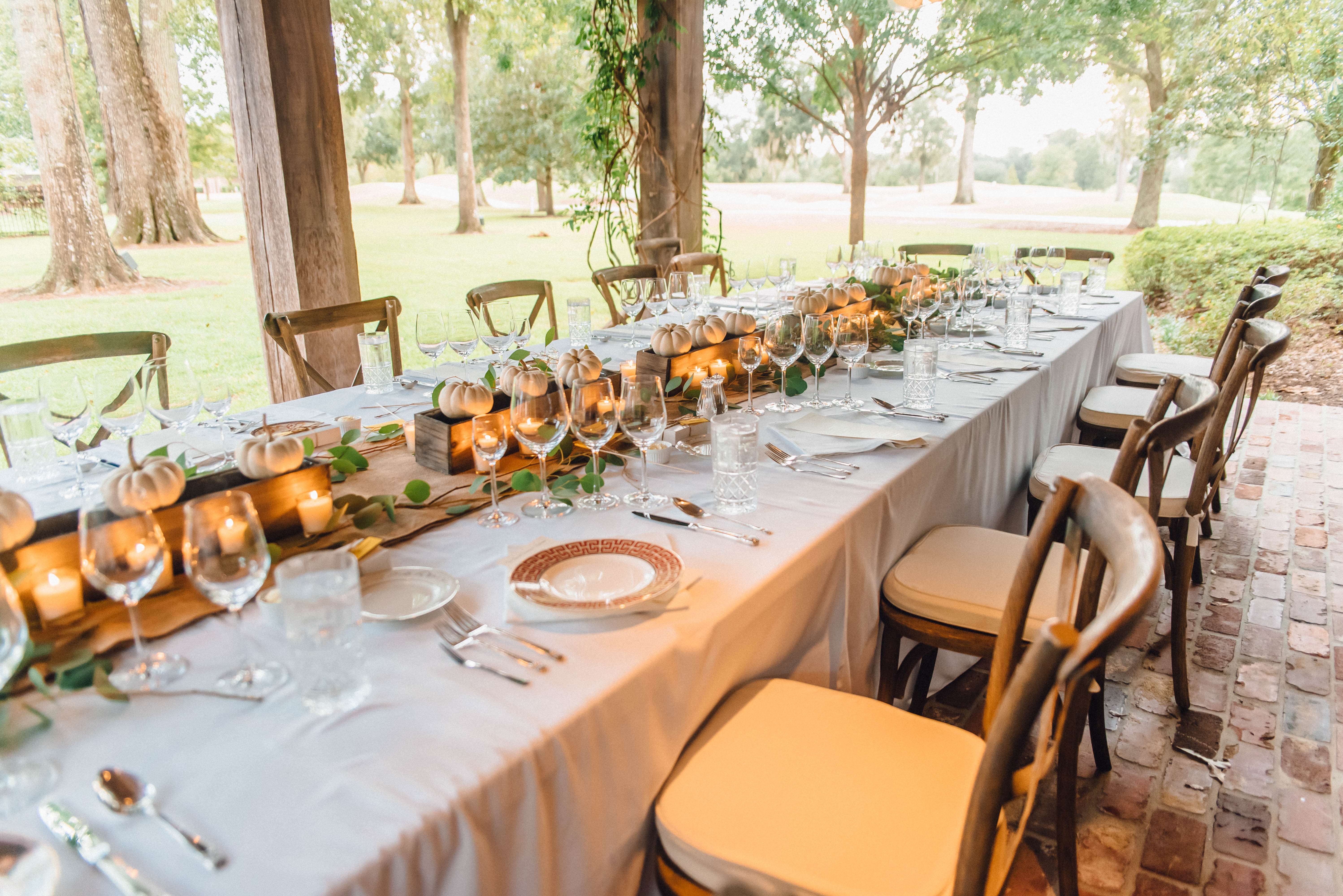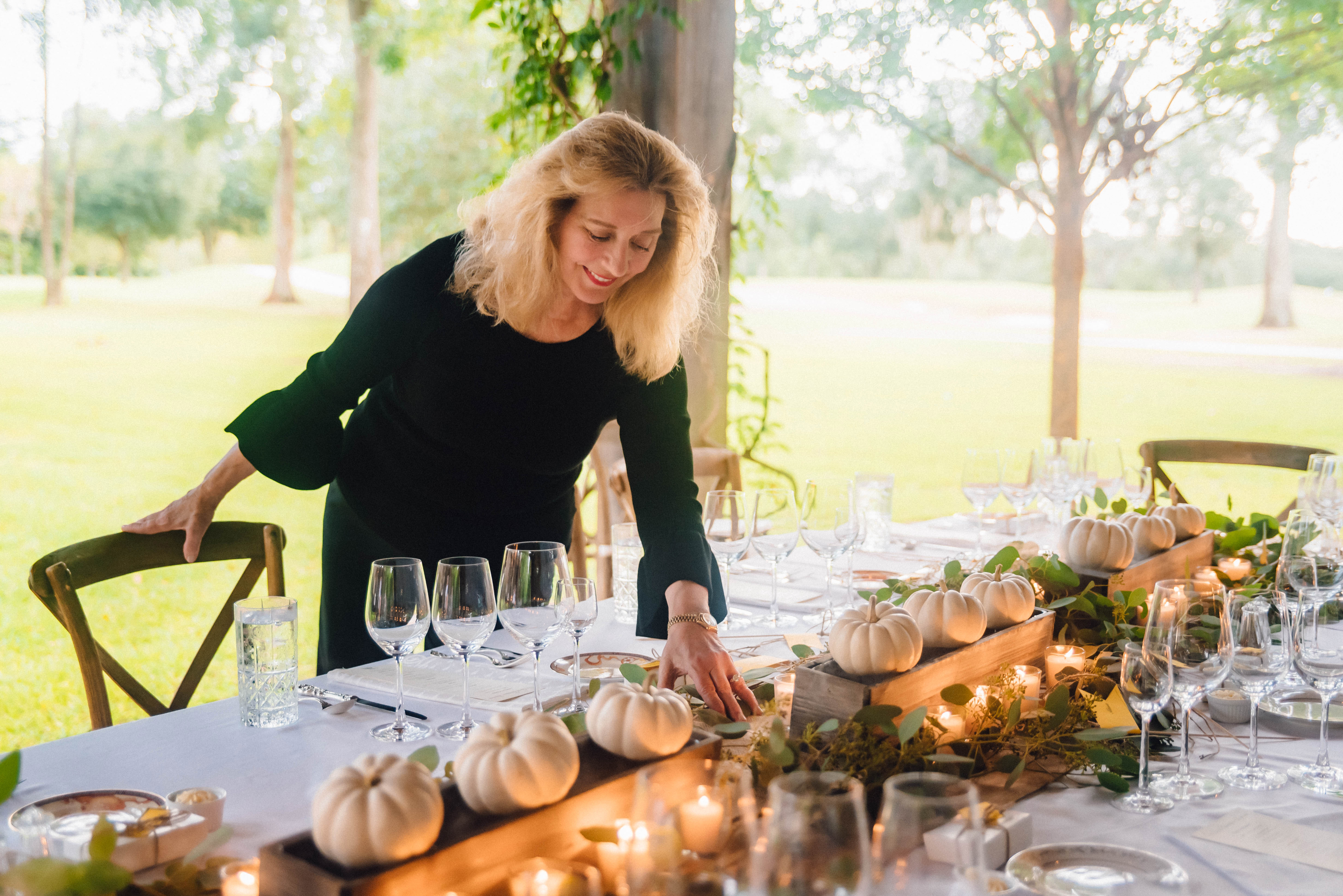 “For this event, we had a Louisiana theme but not a single native flower in bloom,” says Cunard, of creating the fall table-scape with her sister Jeanne. “The lovely little white pumpkins were the necessity of substitution.”