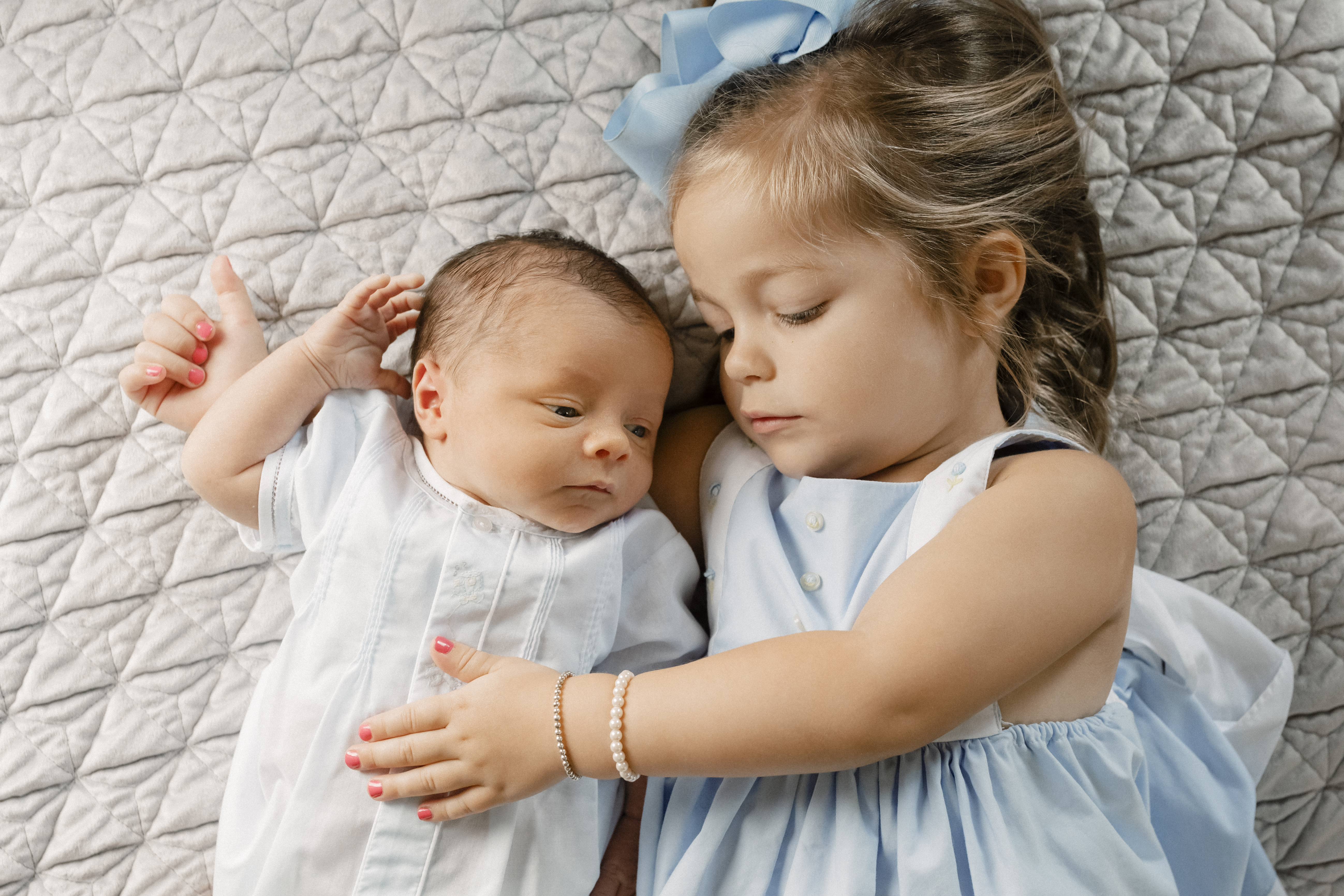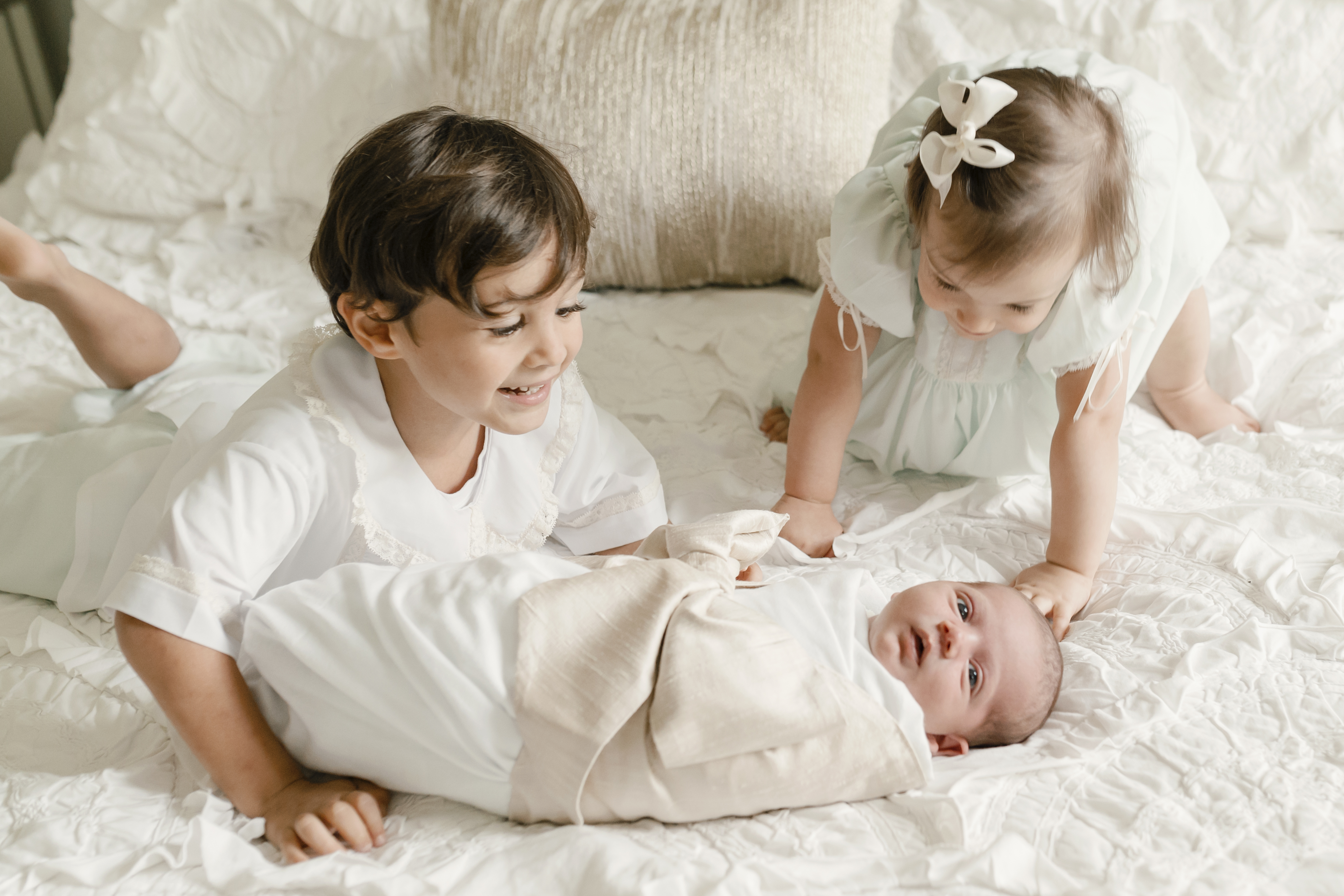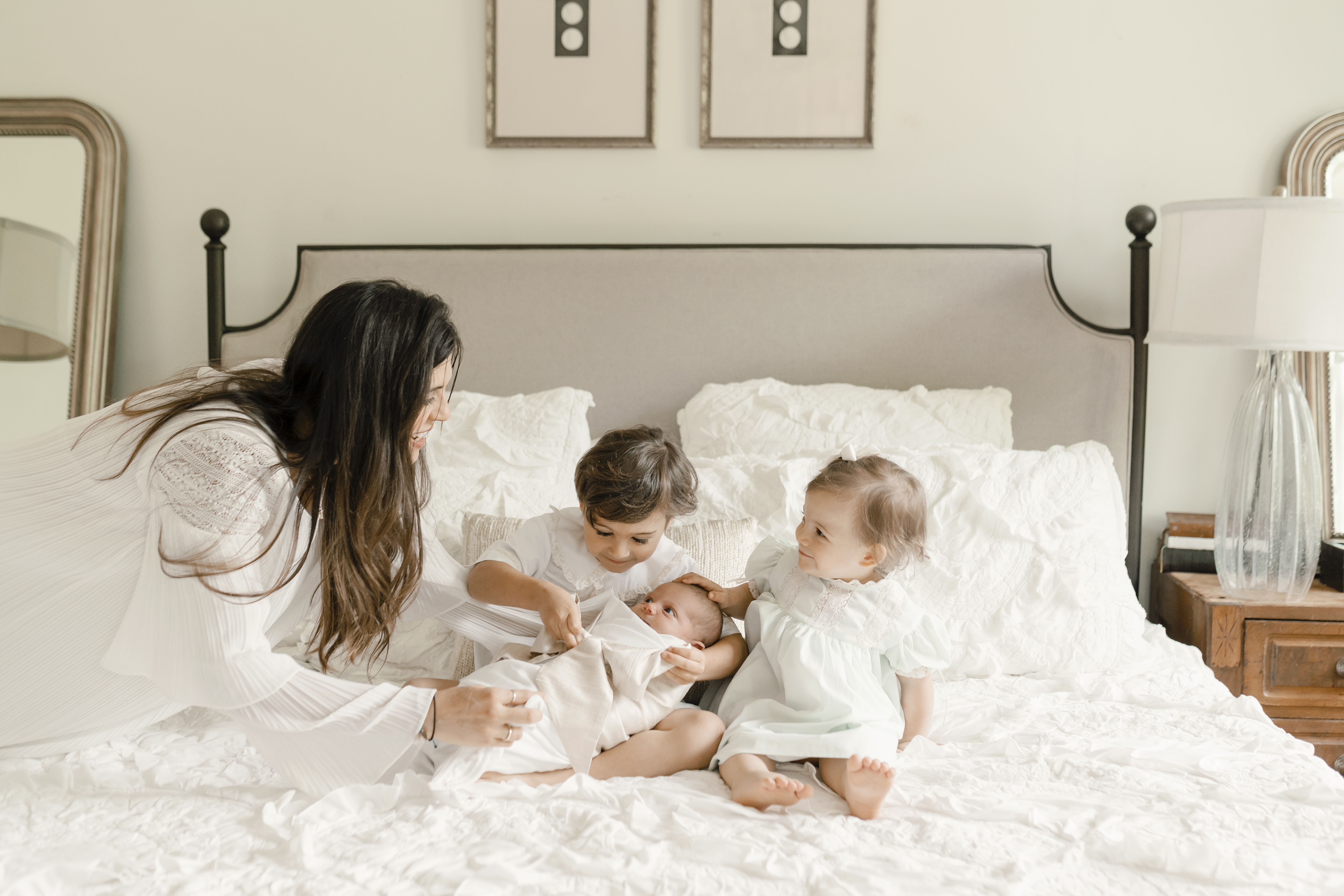 I usually always start with the entire family shots while cooperation is the highest. I like to get everyone in position, and give cues that allow me to capture true interactions as they happen. If there are siblings, I try to always get them with the baby alone as well. Shots with Mom and Dad individually with the baby are always super important. Something about the size of your infant in your arms is just so fleeting. And last, but not least, the baby alone in natural positioning.