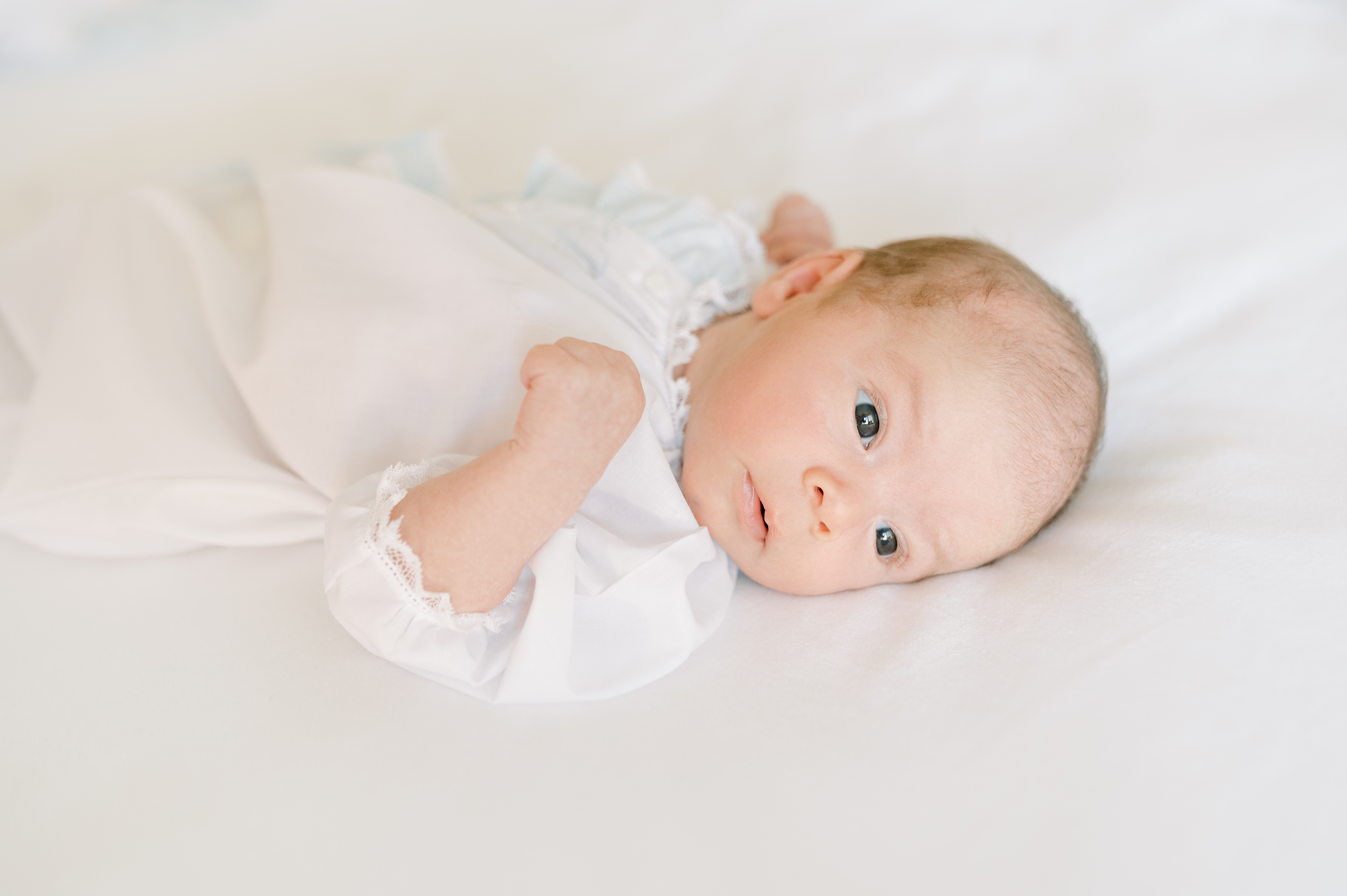 I recommend something classic like a day gown—I especially love soft ones that keep baby comfortable while still looking beautiful. I also like a simple diaper cover for seeing all their baby details, and a swaddle to help keep them content.