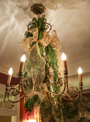 Fresh garlands throughout the house—around mirrors, tied to chandeliers, surrounding doorways, and draping down the stair rail—exuded the signature scent of the holidays. Lance Hayes Flowers provided both the greenery and the towering red and white floral arrangement that served as a centerpiece on the dining room table.
