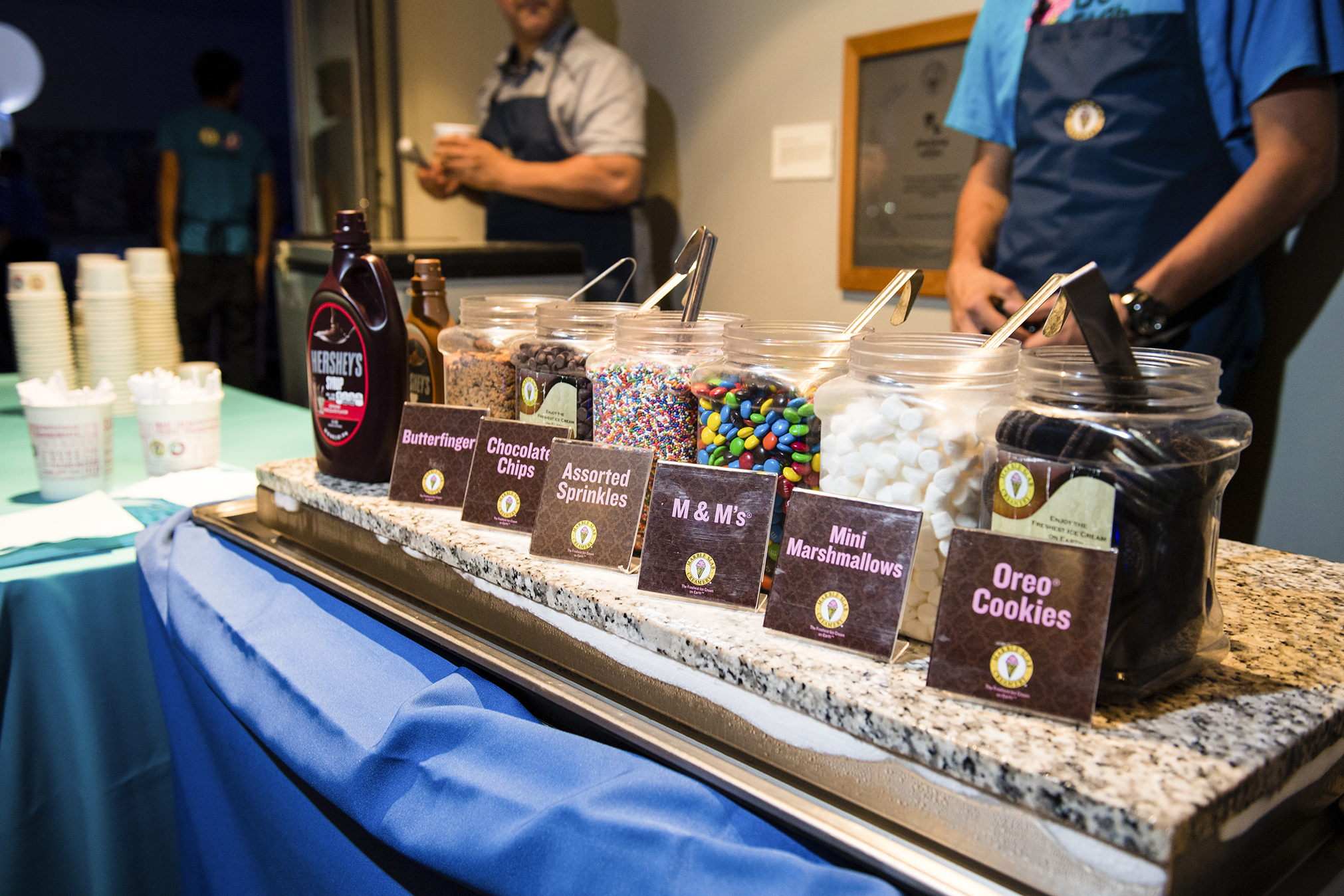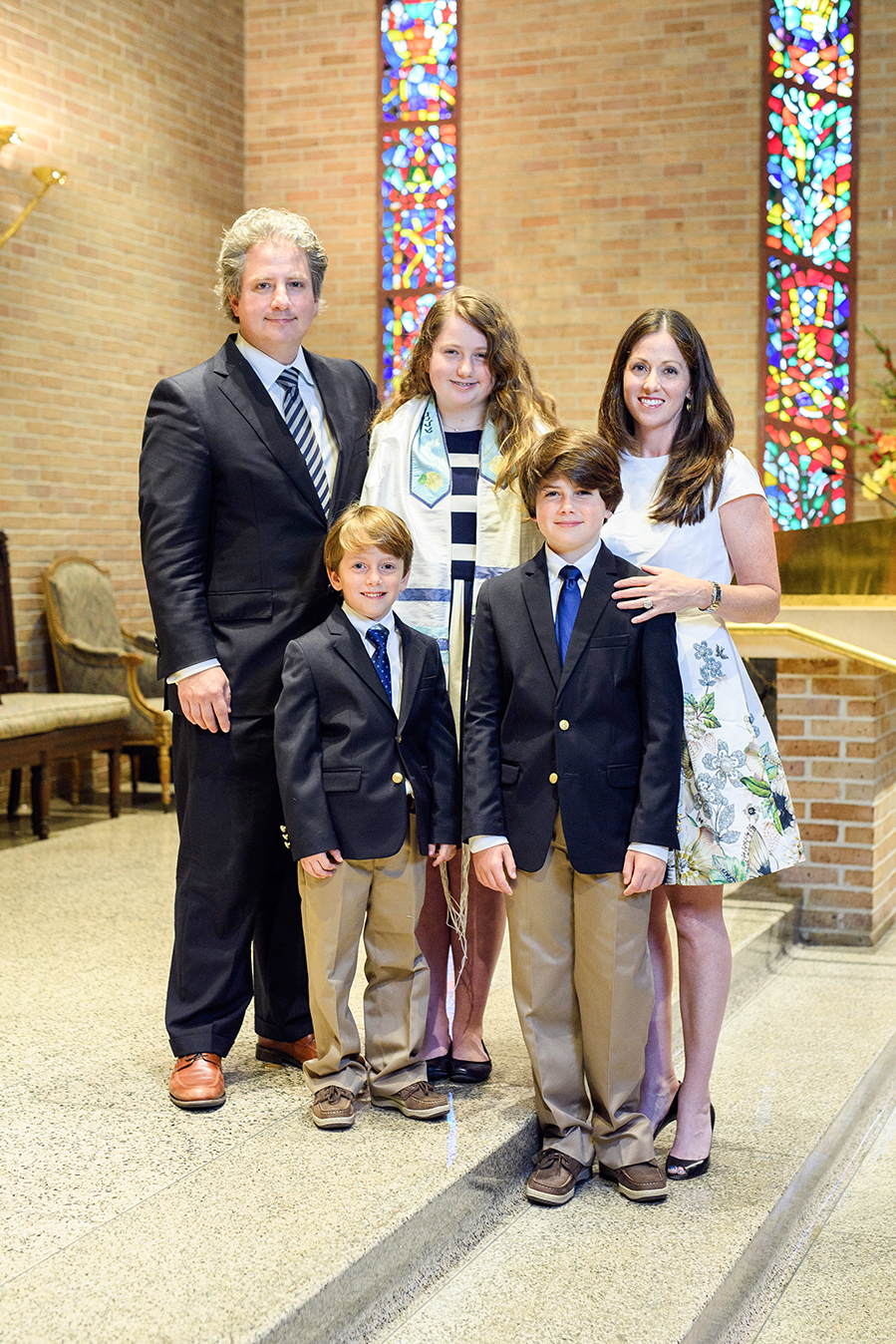 Campbell hired a DJ and incorporated flipbooks and games into the reception following the candle-lighting service at the museum. In lieu of a formal theme, Emily’s monogram was used on everything from linens to cups to lighting on the wall. Guests enjoyed a candy bar and a cupcake decorating station, and Marble Slab was on site to mix ice cream with plenty of toppings. But the festivities of the Saturday-night celebration did not dilute the sacred ceremony of the morning or the importance of the Friday-night ritual, where Emily first stood in front of the entire B’nai Israel congregation and read from the Torah.