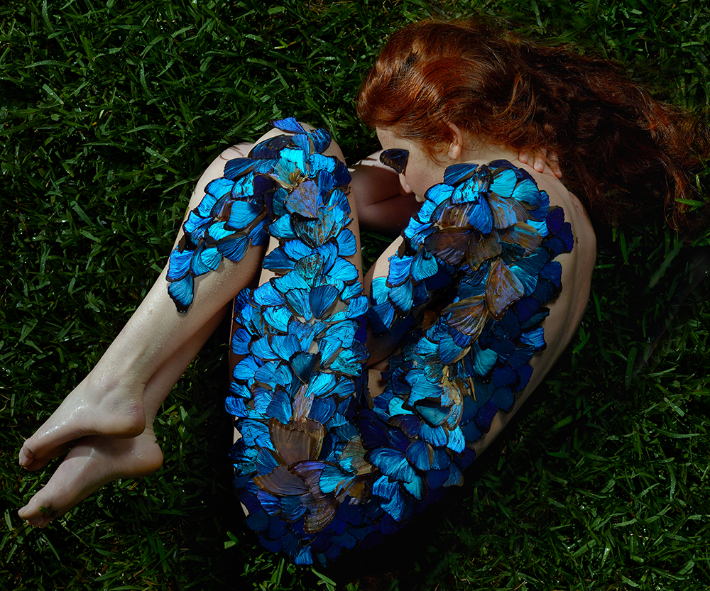 “Some of the works on view explore the tools and techniques that reveal iridescence,” explains Adams. “Jennifer Robison incorporates jewel beetles and morpho butterflies on the surfaces of her photographic works, so that the creatures appear to come to life from the image. Kate Nichols uses nanoparticles to mimic the physical properties of natural iridescence in her glass paintings.”
