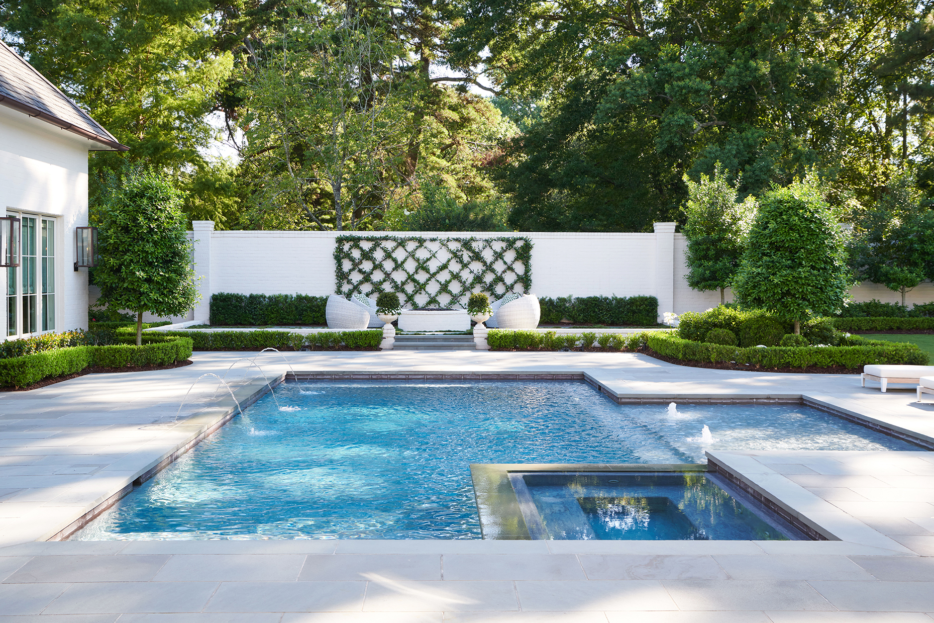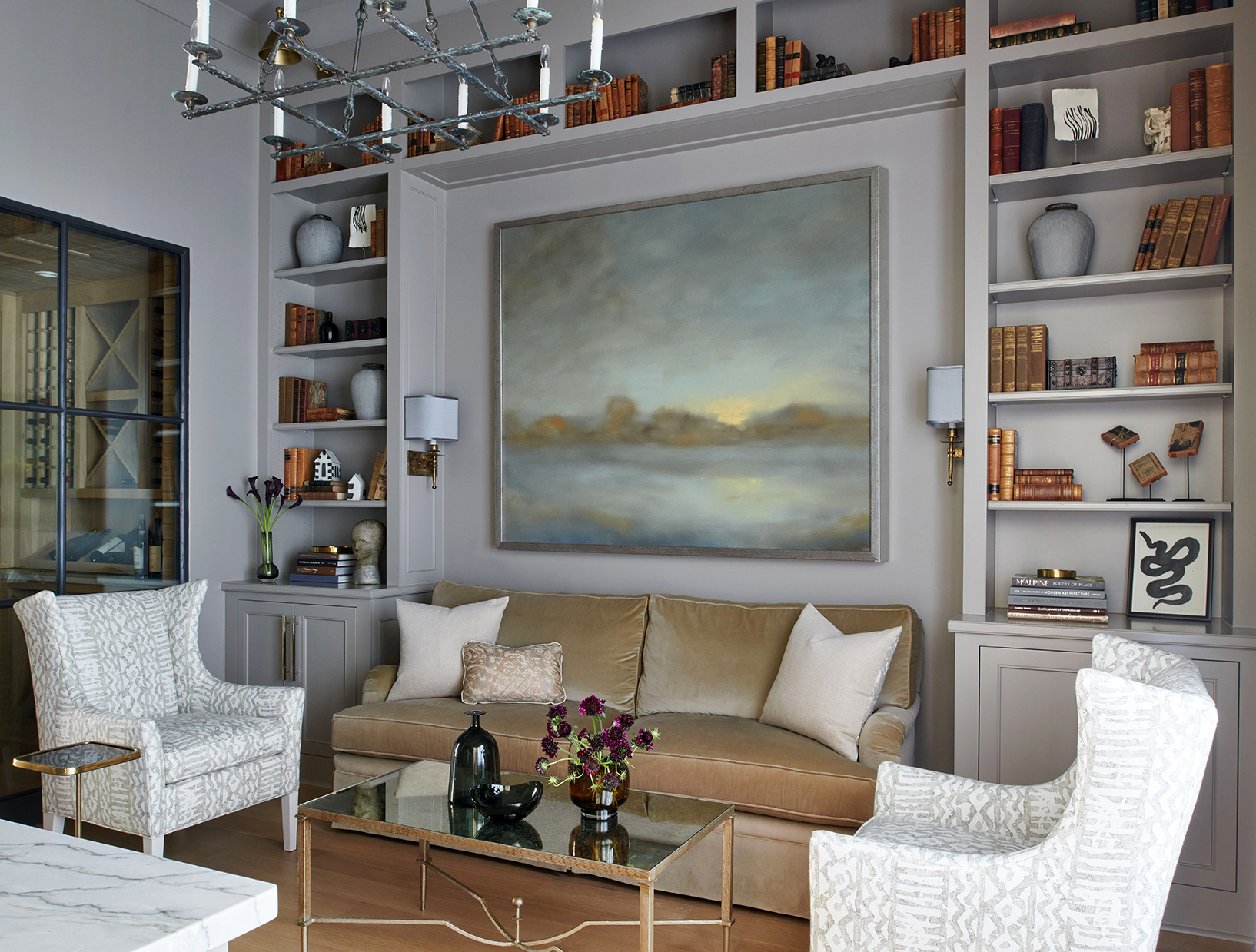 Light pours through the large panes of the steel and glass windows in the kitchen and casts its rays on the sitting room sofa where two King Charles Spaniels, Maddie and Mason, bask in its glow. Beyond is a quintessential scene: morning sun glinting off the pool water and blue stone surround, extending the vision to the vibrant green lawn and landscape, definitively designed and meticulously maintained. It is a cup-of-coffee-in-the-hand kind of morning, with the outside temps still cool enough to sit on the back porch and enjoy the spring breeze.
