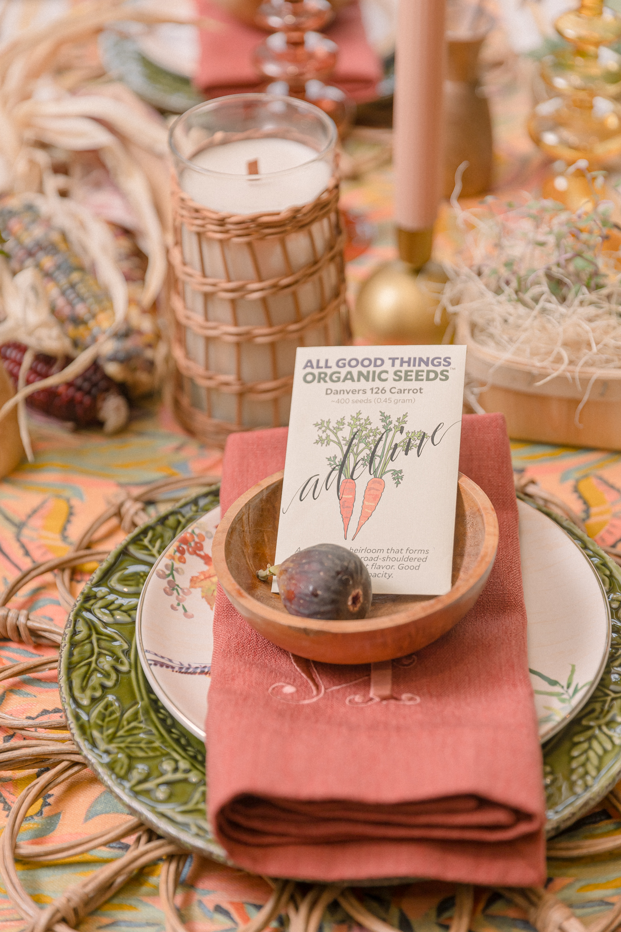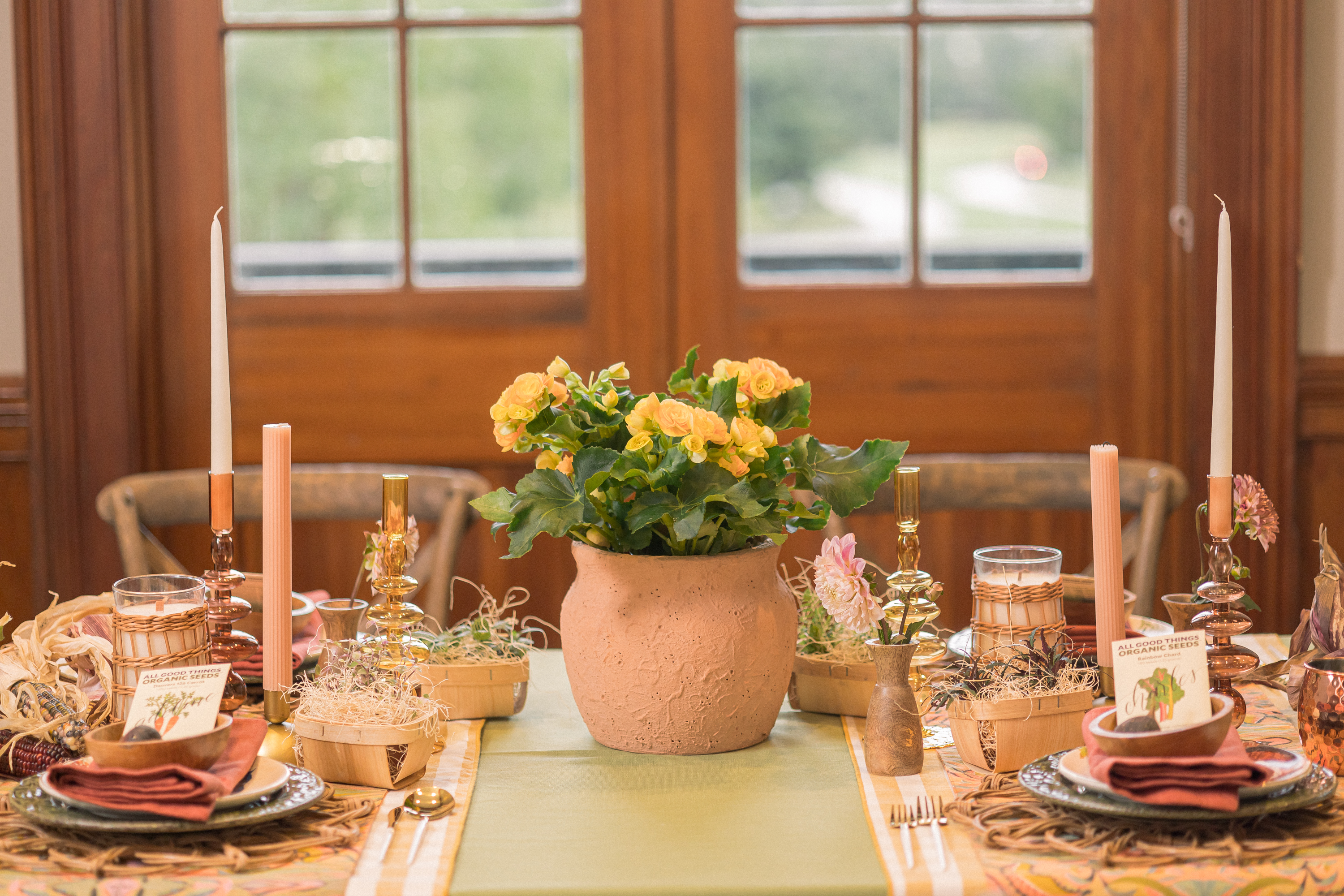 But the earthy fun doesn’t stop there. Babin added little decorative details down the table to bring extra layers of interest–think copper Moscow mule mugs, seasonal flint corn, wicker candle holders, and even seed packets that double as place cards.
