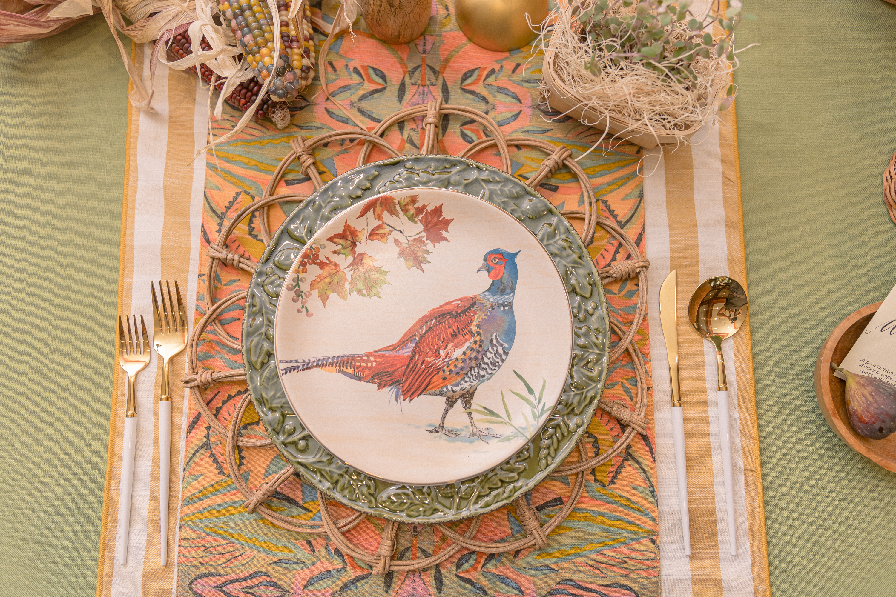 To achieve this look, start with a sage green tablecloth, then place two layers of vibrantly colored runners across the table to serve as unlikely double placemats. Add rattan chargers at each place, and top with two different styles of plates; here, Angela DiVincenti Babin of Angela Marie Events used a green embossed dinner plate beneath a bird-themed plate, both from Hobby Lobby. Gold-toned flatware with white handles is in keeping with the warm vibe.
