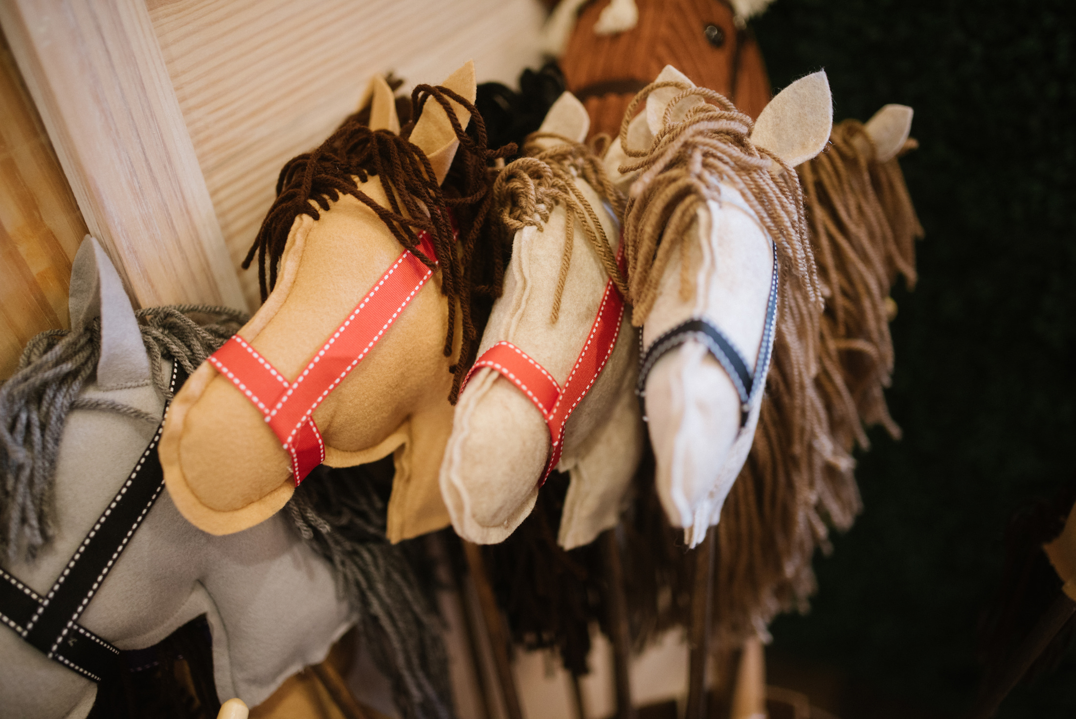 Handmade stick horses from My Lue on Etsy were used for racing later in the day at Deckert’s first birthday party. Party by Angela Marie Events. Photo by Lauren Carroll.