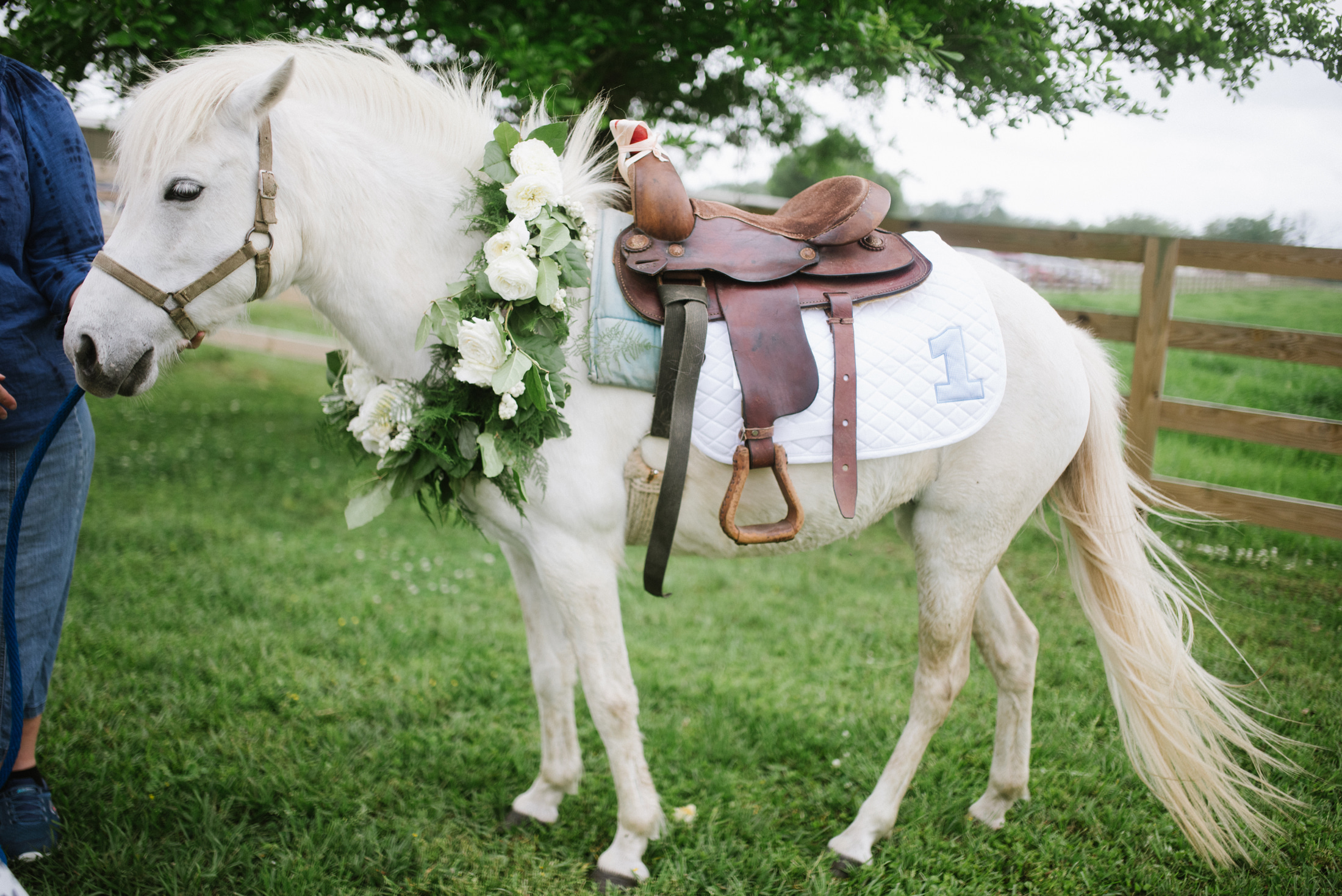 A Derby-themed first birthday for Angela DiVincenti Babin’s son Deckert would not be complete without a white pony adorned with flowers and a themed saddle blanket. Party by Angela Marie Events. Photo by Lauren Carroll.