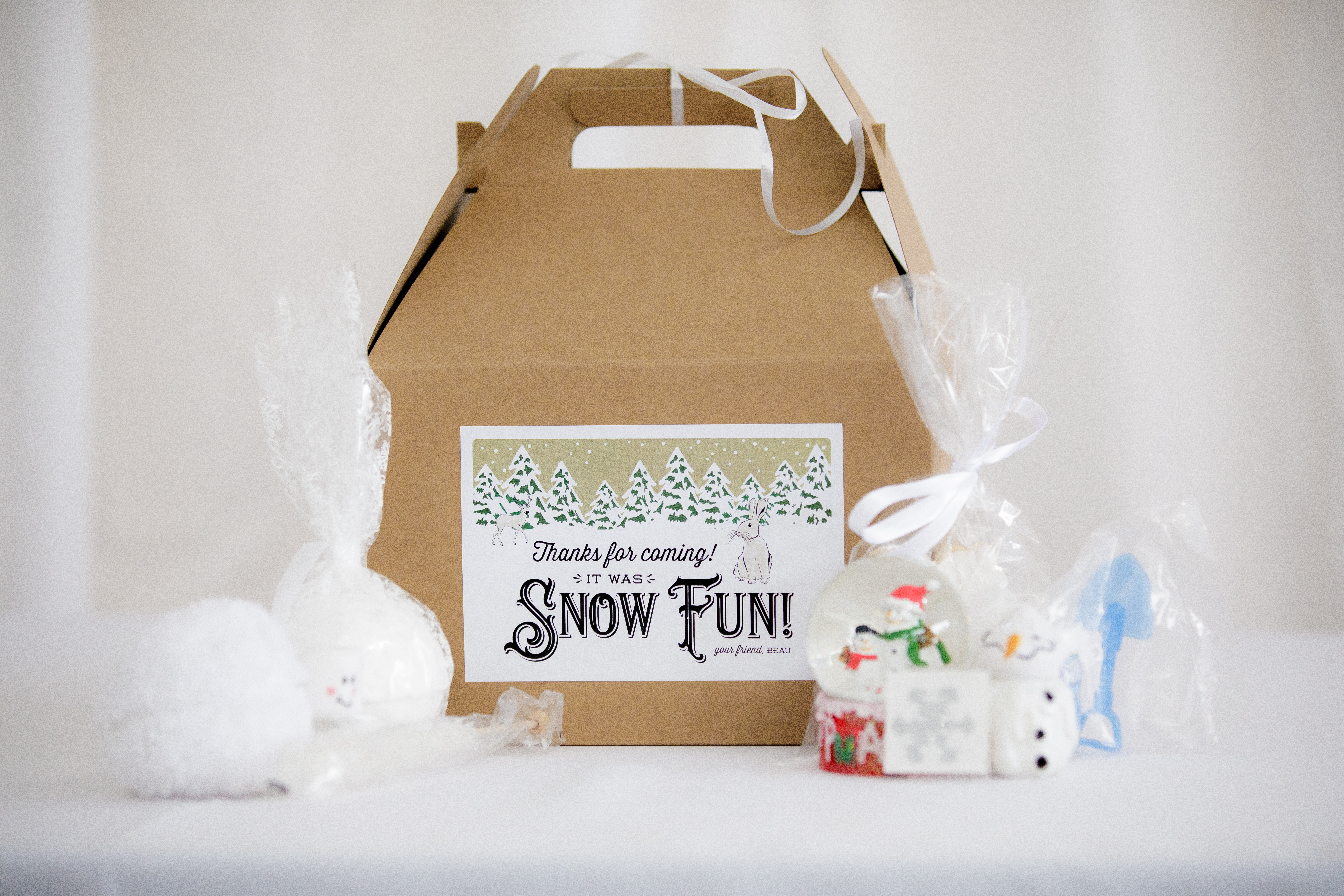 Lauren Haddox Designs helped create the branding for Beau Henderson’s snow-themed birthday party. Favor boxes were filled with snow globes and other trinket. Party by Angela Marie Events. Photo by Rayne Film Studio.