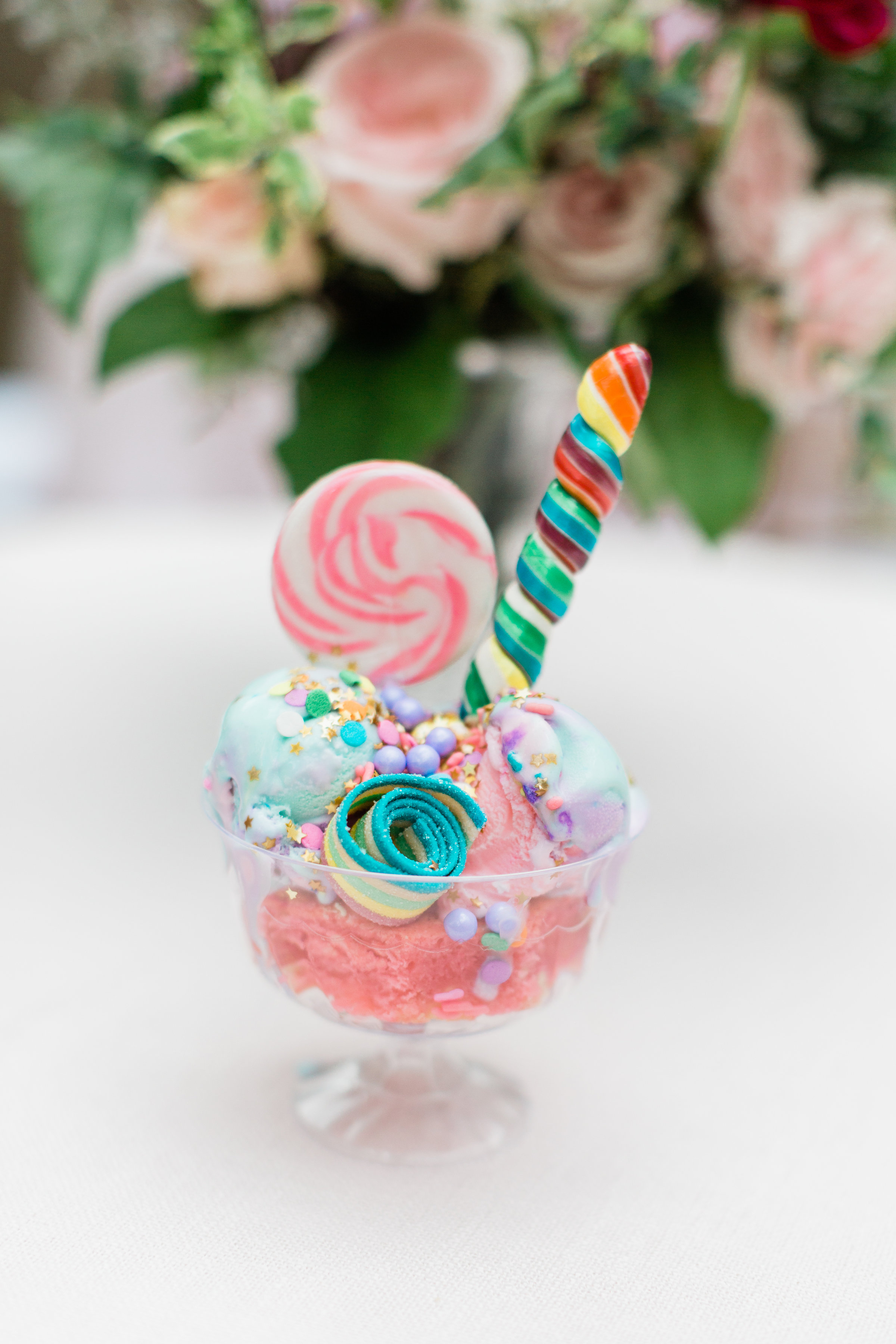The desserts at a unicorn-themed baby shower were anything but ordinary, with rainbow candy ice cream provided by Small Cakes. Party by Angela Marie Events. Photo by Carolynn Seibert.