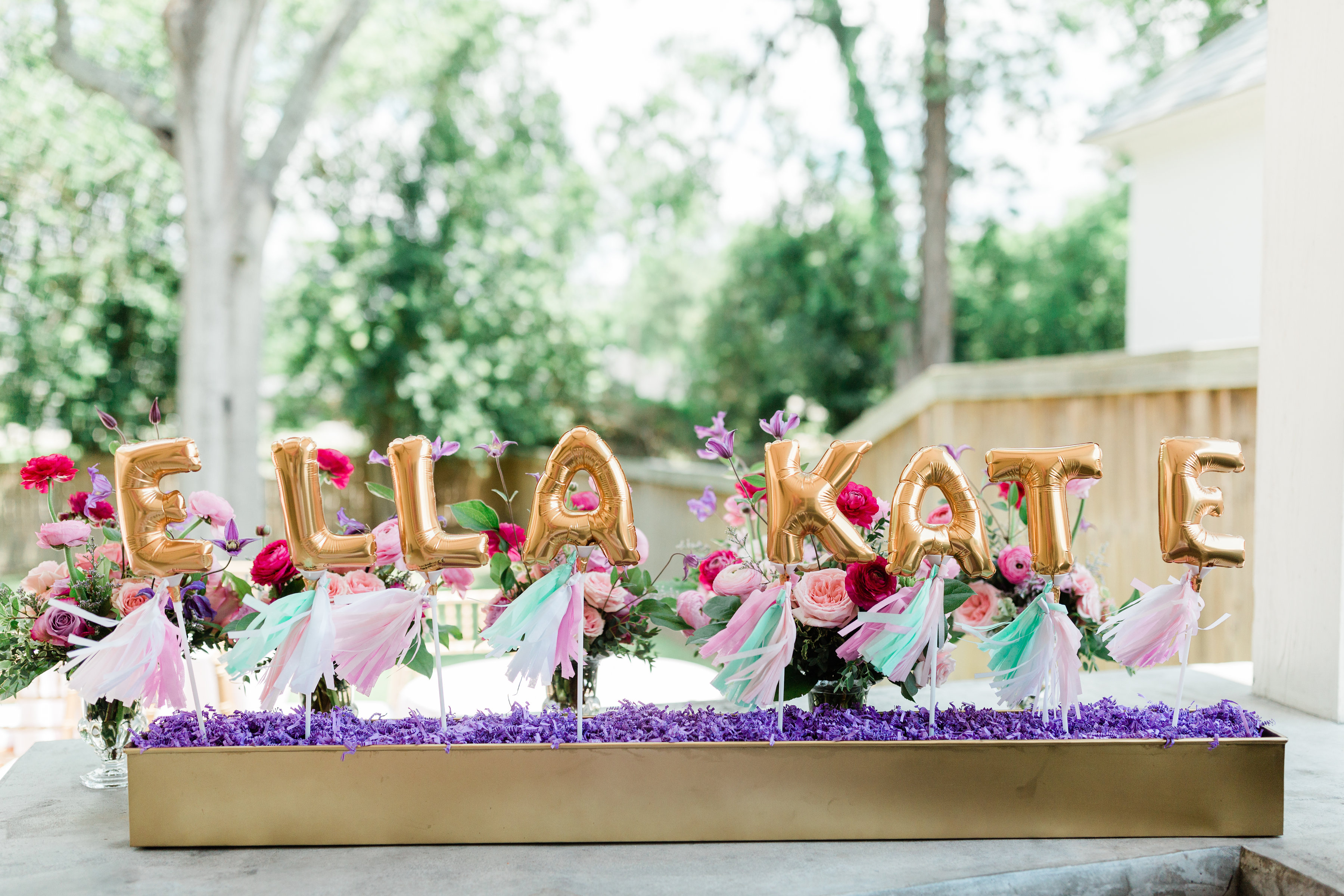 Simple but eye-catching, small, gold foil balloons from Balloon Mania pulled together tables at a baby shower celebrating the arrival of Ella Kate Speights. Party by Angela Marie Events. Photo by Carolynn Seibert.