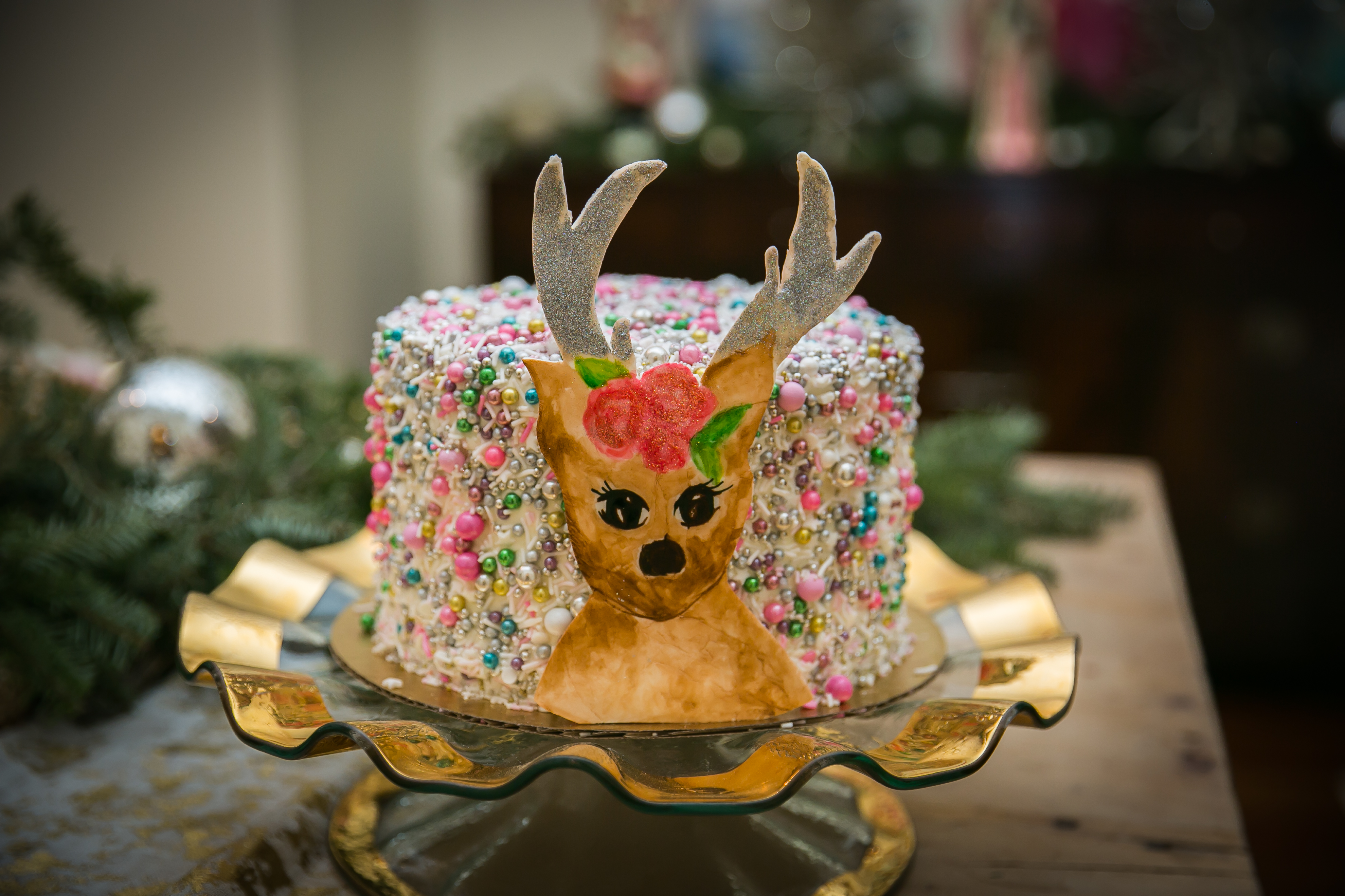 A bright, sprinkle reindeer cake by Gourmet Girls made the perfect dessert and work of art at Lexie Polito’s annual Champagne and Candy Canes party. Party by Lexie Polito. Photo by Jenn Ocken.