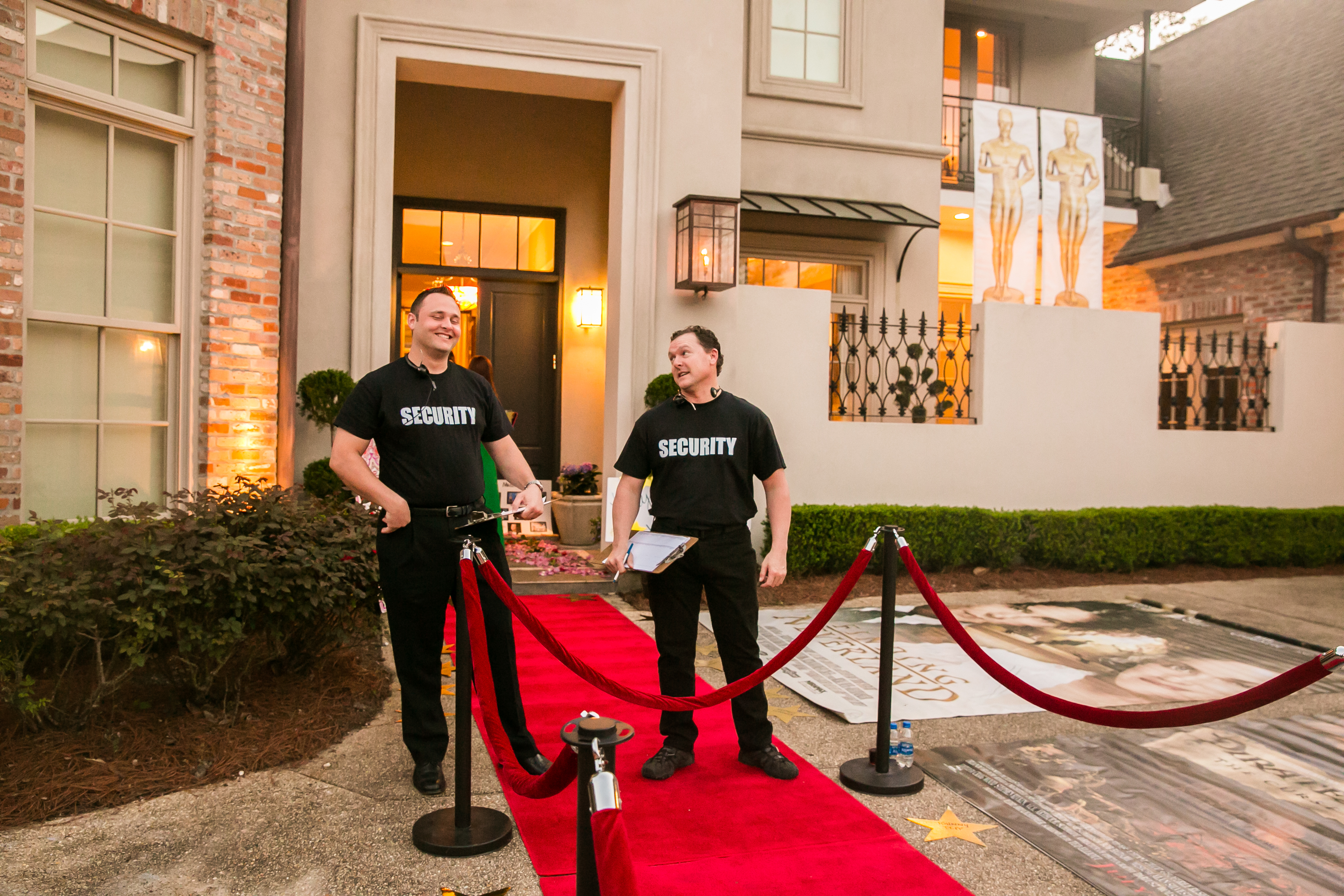 Theming for Laurie Aronson, Marcia Sanchez and Lauren Eglin’s annual Oscar party extends as far as including security to check that guests’ names are on the list. Photo by Jenn Ocken.