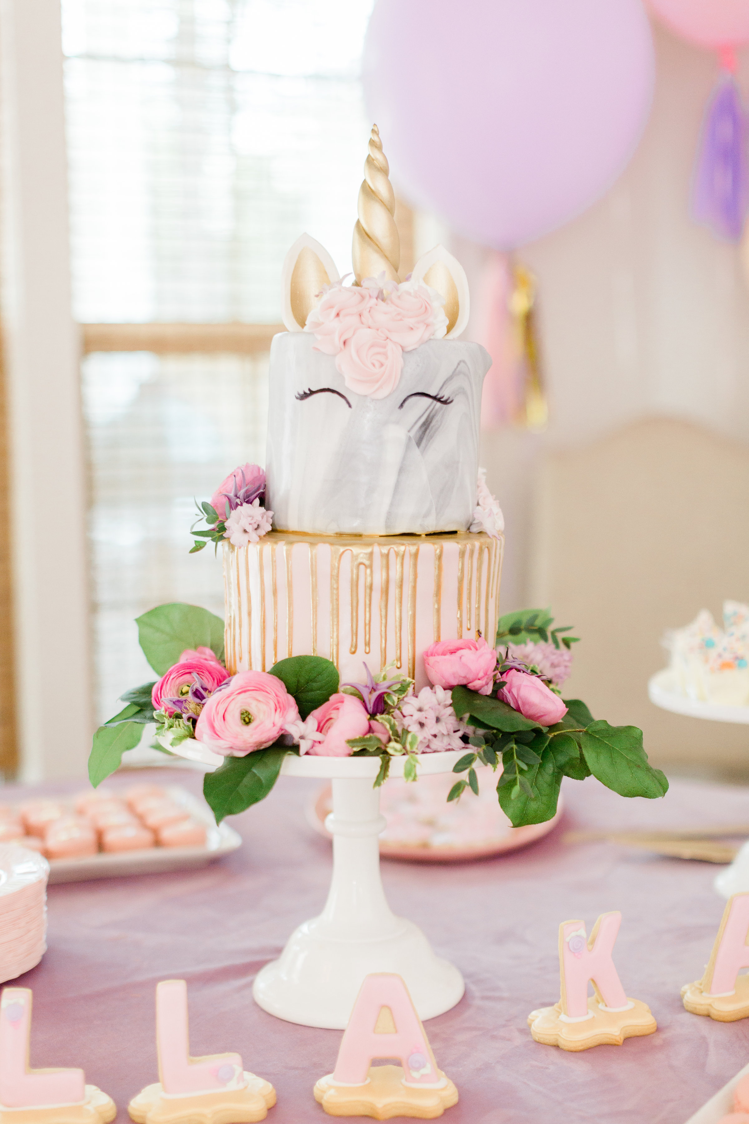 The unicorn cake has been everywhere this year. In this version, The Ambrosia Bakery added gold drip and marbling to give it a unique look. Party by Angela Marie Events. Photo by Carolynn Seibert.