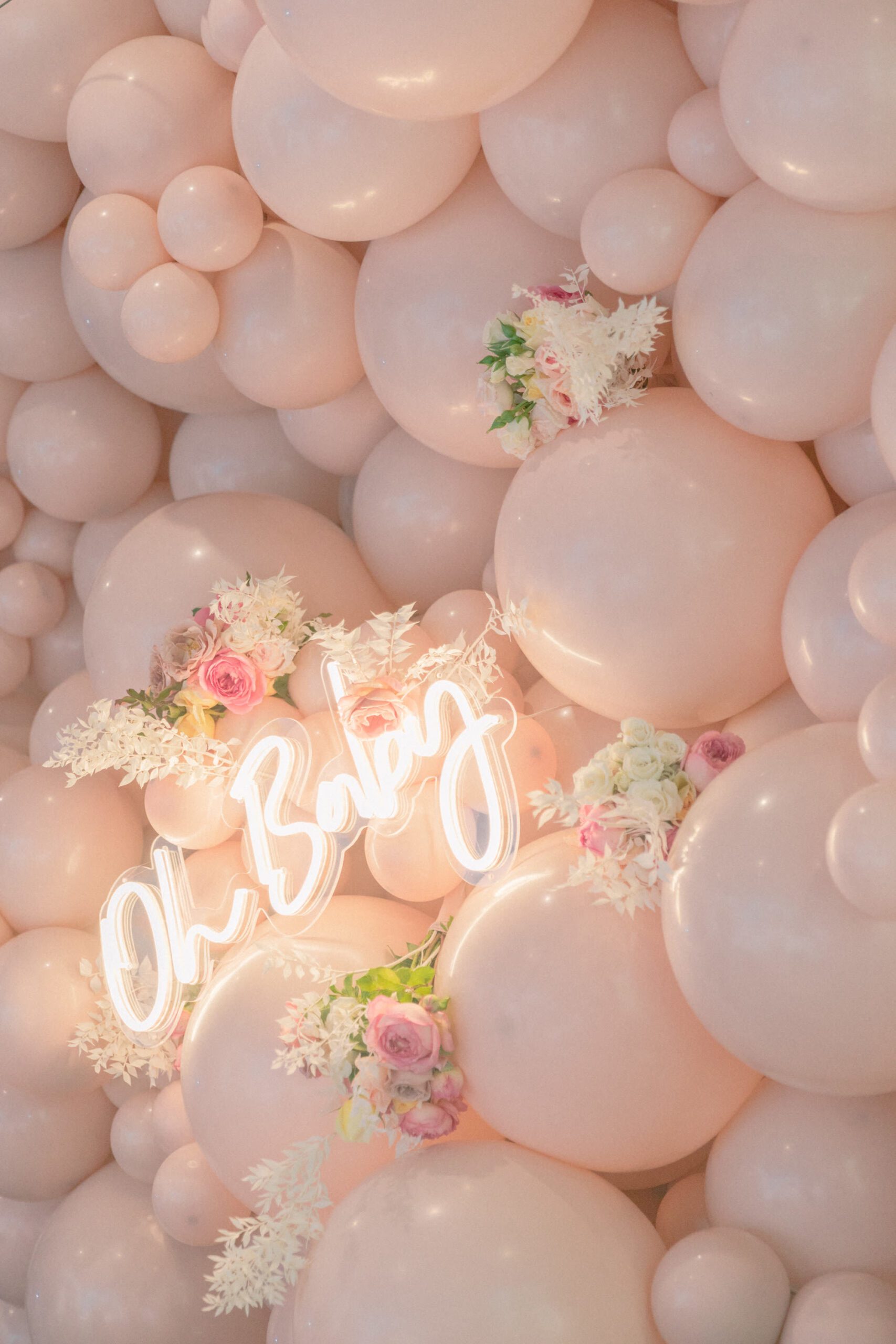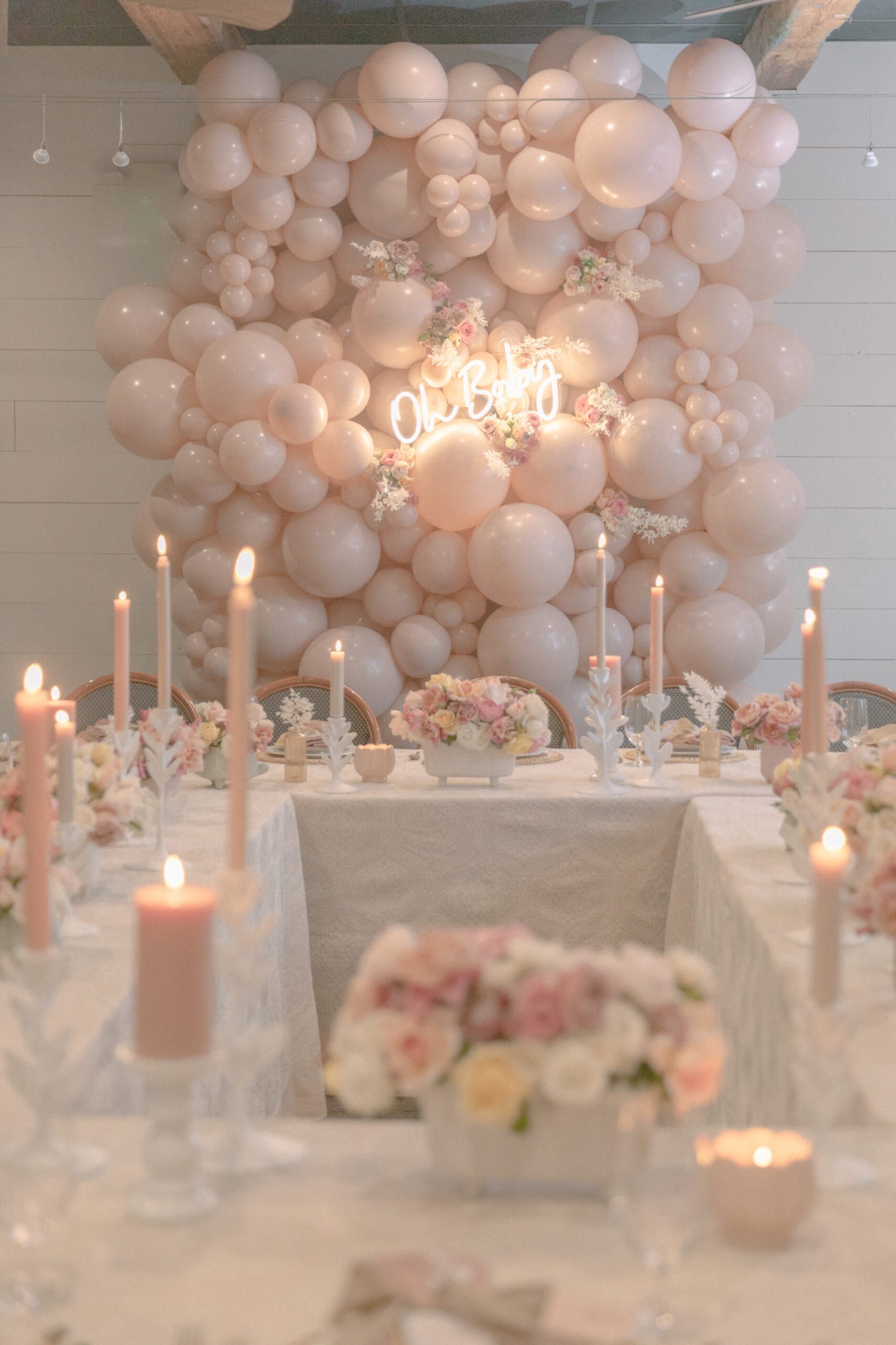 Those colors were woven throughout, from the balloon wall complete with a neon sign to the linens and even the roses, which Babin special-ordered from Grace Rose Farm in California.