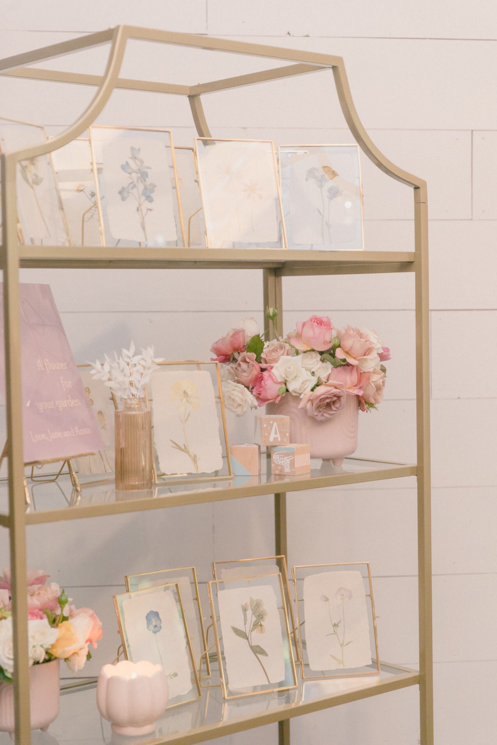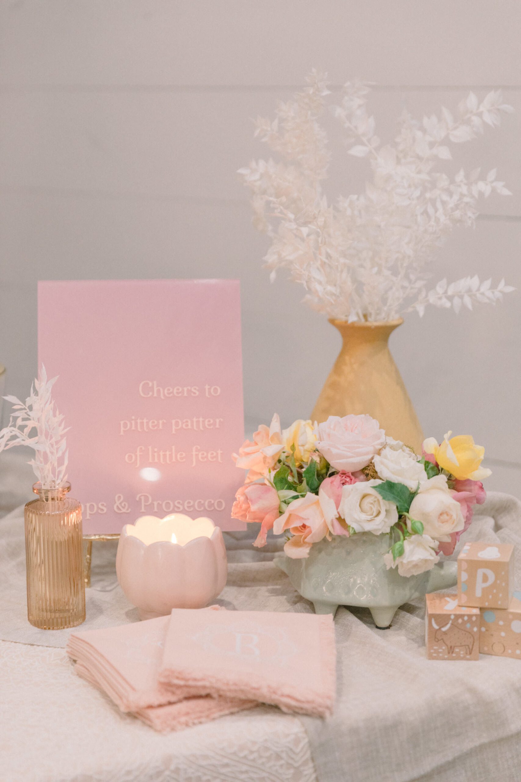 “Whenever I do a baby shower, I always like to include little things for the mom to keep,” planner Angela DiVincenti Babin explains. “It brings in that baby vibe, and it makes for special keepsakes and additions to the nursery.”
