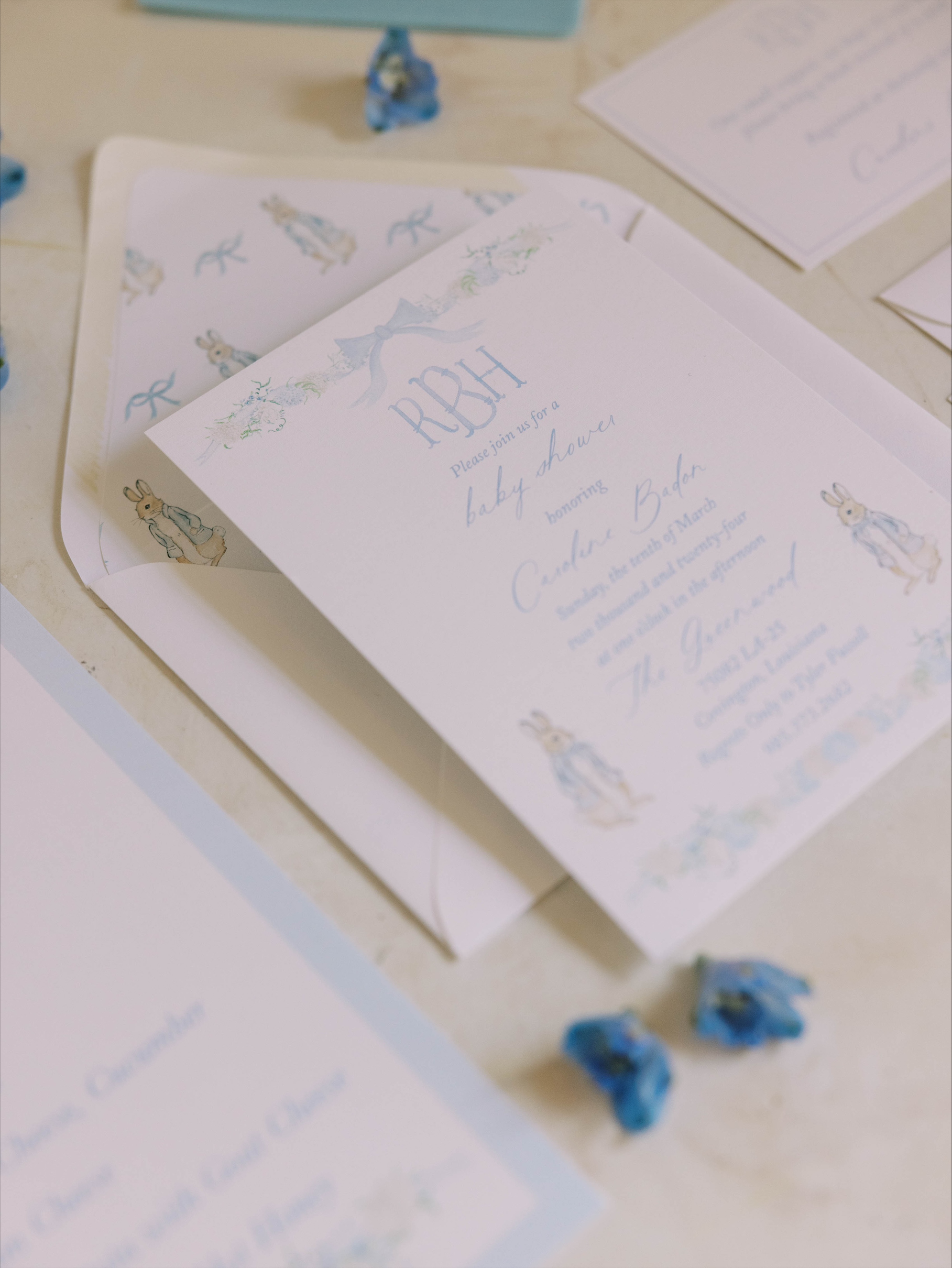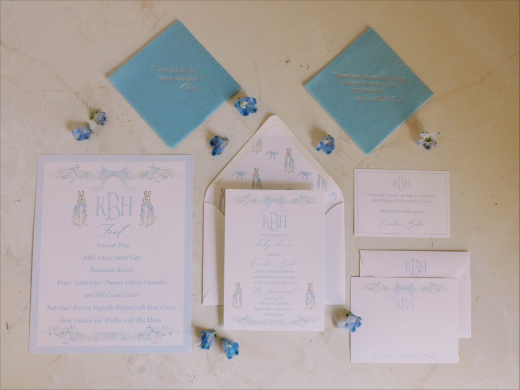The celebration also included an interactive floral bouquet bar for guests, an acoustic guitarist for entertainment, cocktail and lunch napkins with custom watercolor designs and sentimental quotes, a Peter Rabbit sign-in book and more.