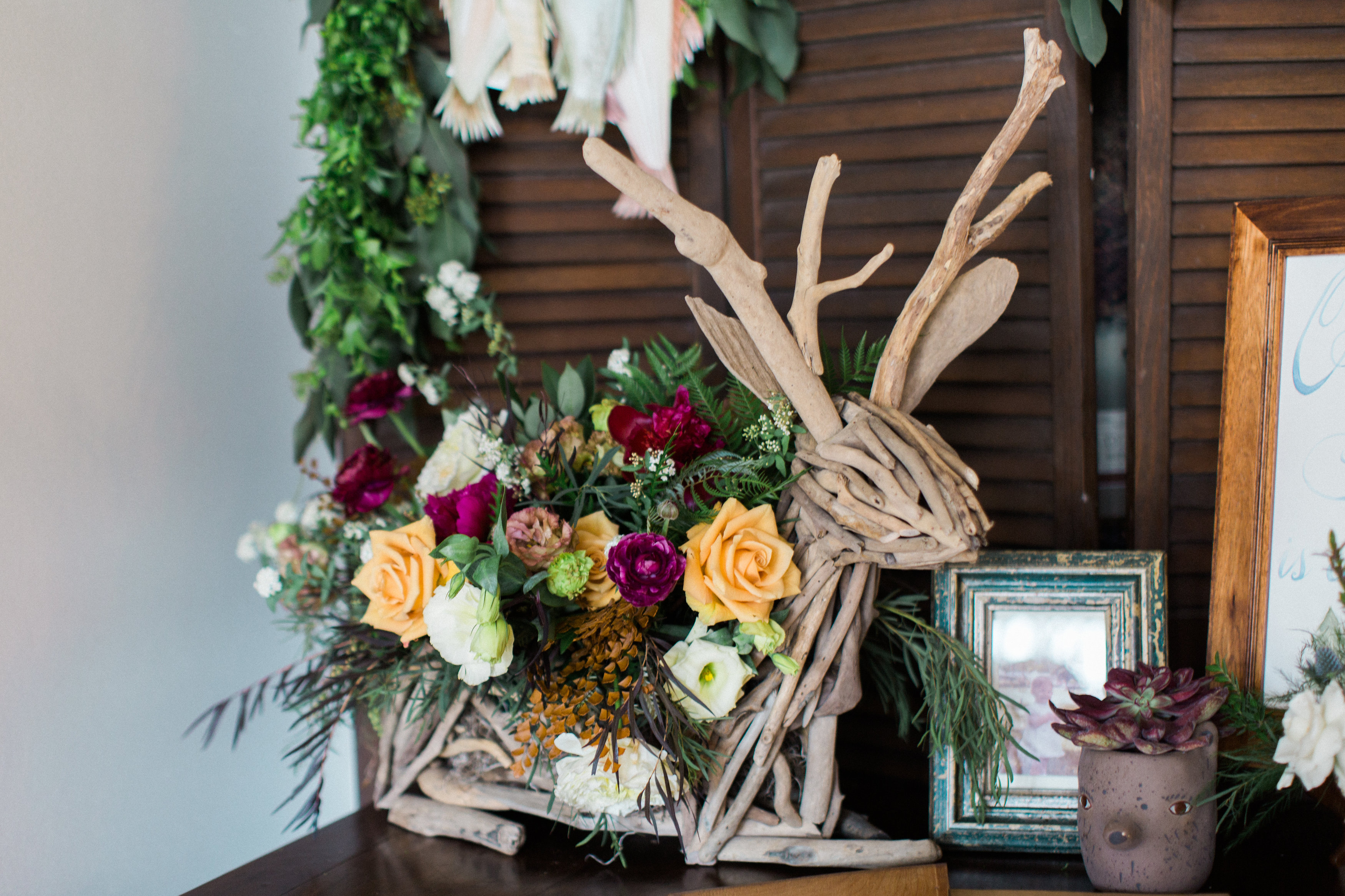 Driftwood deer perfectly showcased floral arrangements created by Poppy & Mint Floral Co. for a soft and outdoorsy baby shower.