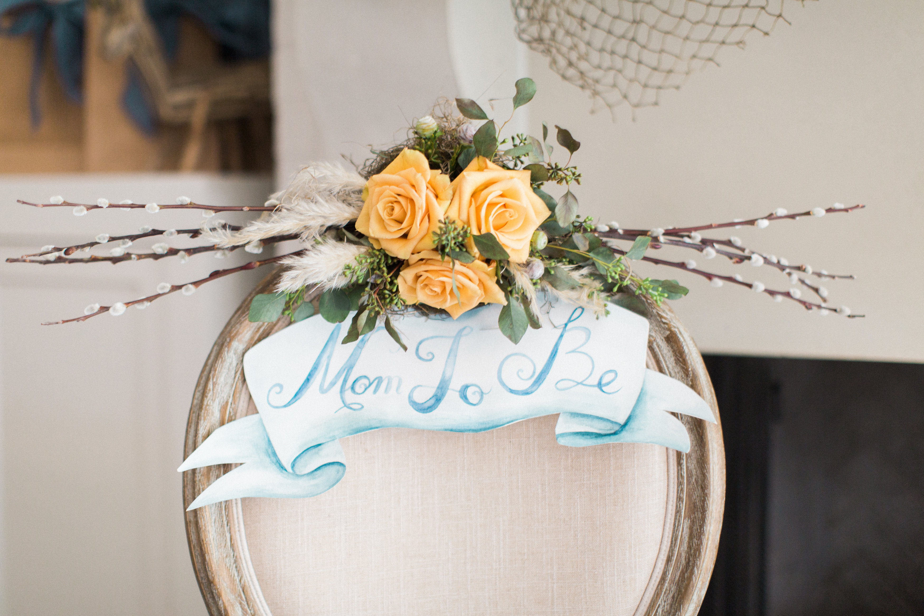 A light blue banner with charming cursive created a special seat for a new mom at her baby shower. Photo by Carolynn Seibert.