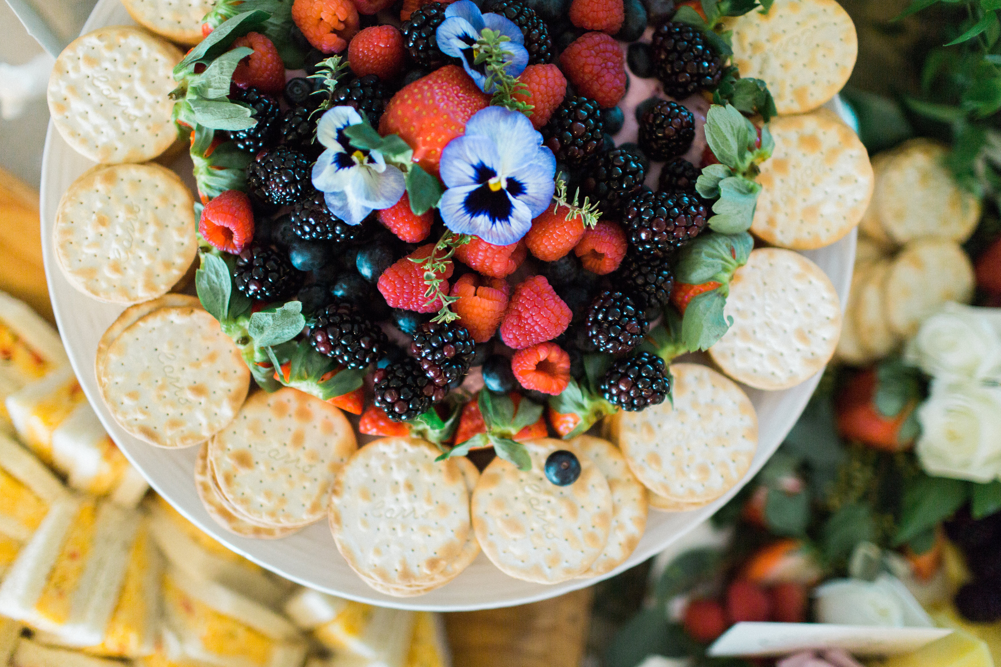 Fresh fruit and contrasting flowers completed a cheese and cracker spread at a baby shower. Photo by Carolynn Seibert.