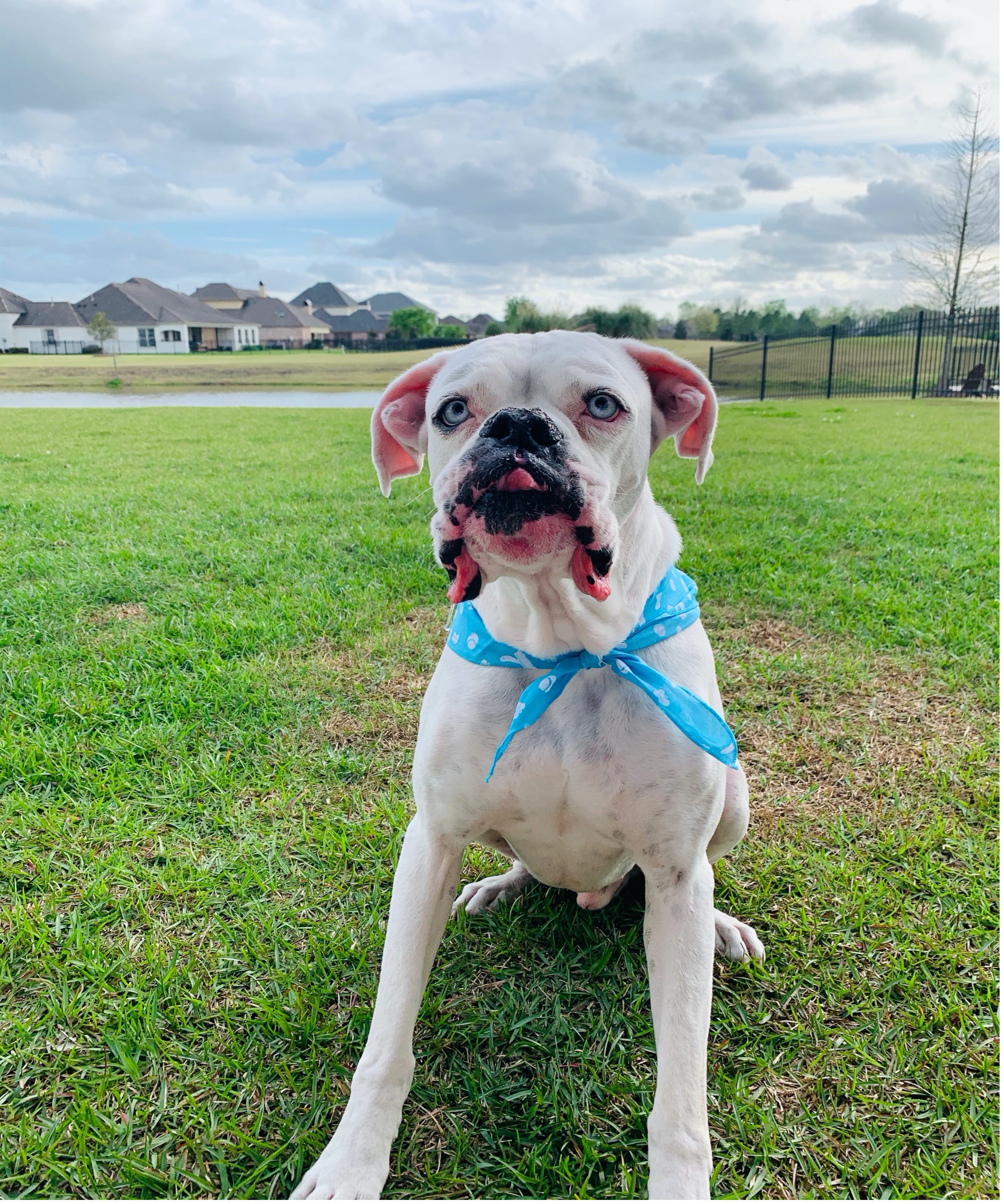 “Honey Bun has the sweetest personality. She enjoys swimming, lounging on her own pool raft, fishing, and being with her family 24/7. She is always found with a smile on her face and will give you tons of puppy kisses if you get too close.”