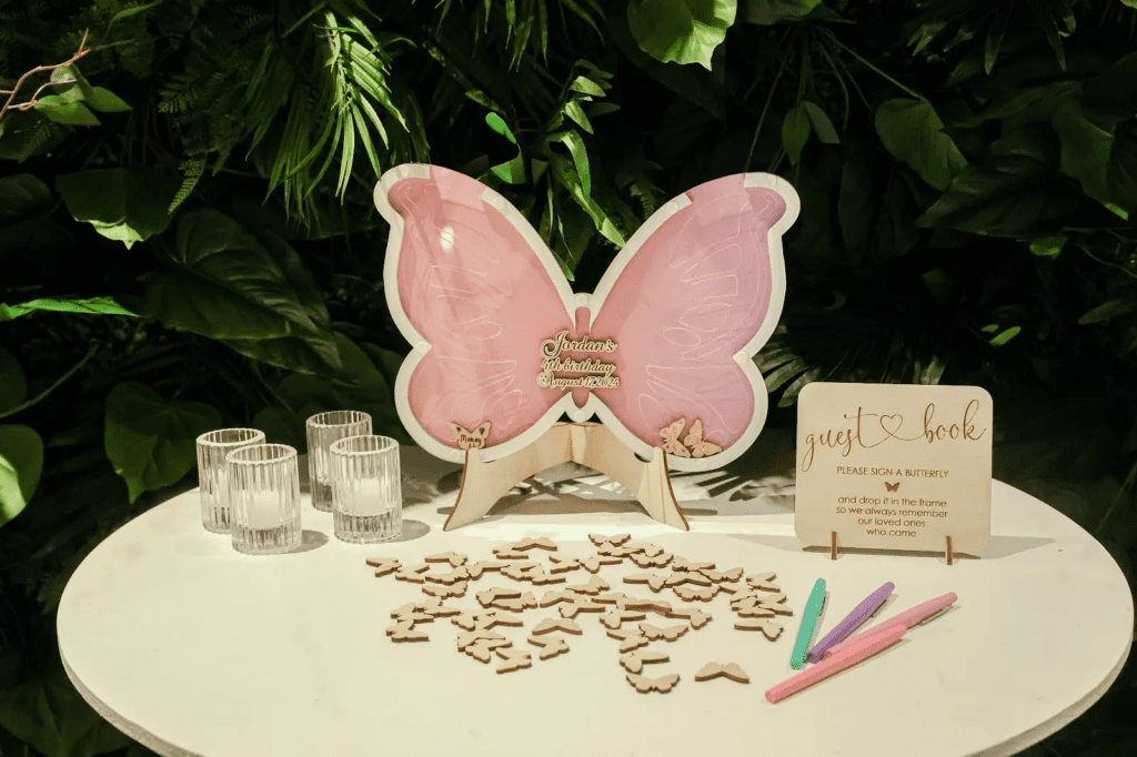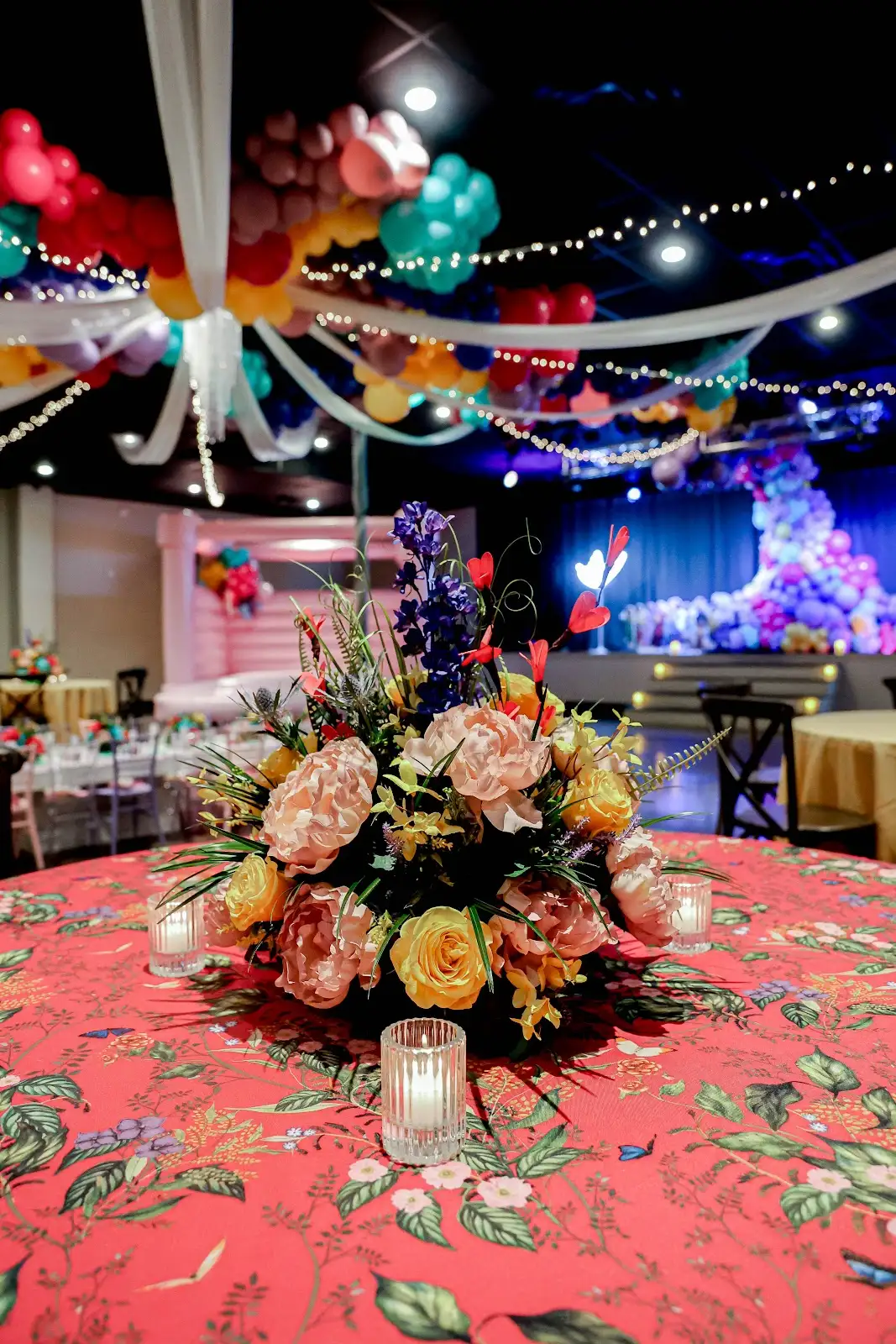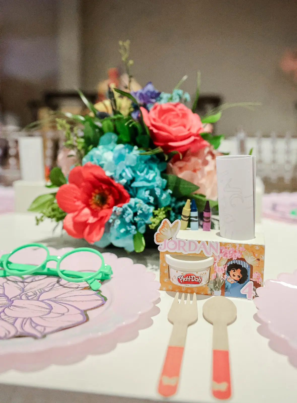 Harden included elements from the film, such as butterflies, flowers, enchantment and more. The party was filled with shades of blues, warm pinks, golden yellows, purples and a few neutral hues to make it feel like they were in the movie. “From the bounce house colors to the floral details on the table linens, it felt as if we’d recreated a scene from Encanto,” Harden says.