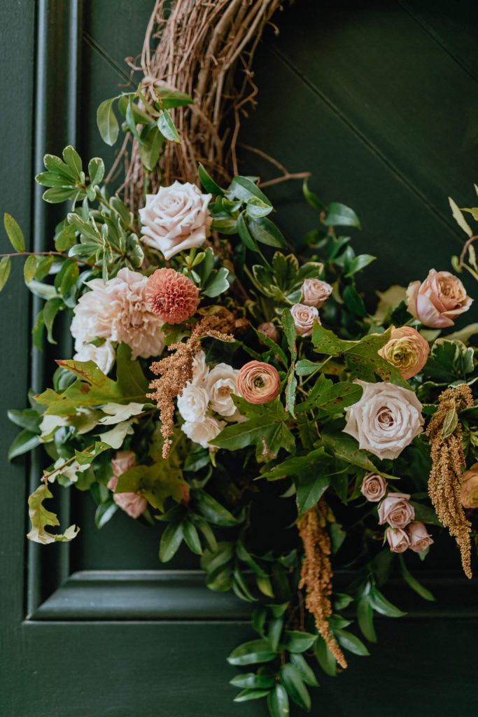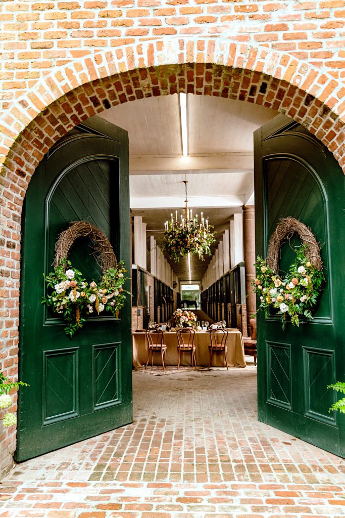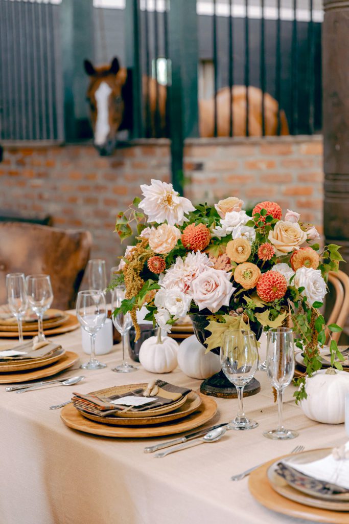 From the moment visitors arrive at the Live Oak Arabians barn, it’s obvious that this is no ordinary day in the hay. The arched front doors are set off with oversized grapevine wreaths upon which Babin has affixed flowers in shades of coral, bronze, copper, mustard and peach. “It’s a color palette that’s not traditional for Thanksgiving,” Babin says. “It kind of brings the masculine feel of the barn together with a feminine element that’s unexpected.”