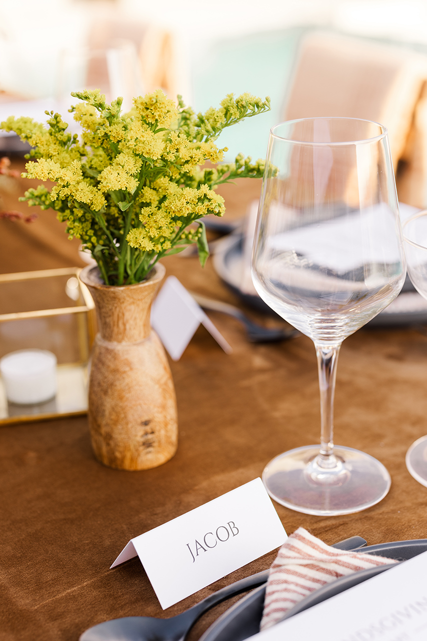 To set the stage for the meal, a simple long table was pulled poolside on the building’s rooftop terrace and draped in a camel-colored velvet tablecloth. Babin surrounded the table with wood and metal folding garden chairs. “Less is more for a party like this,” she says. “That also reflects the design of the building, with its clean lines and minimalist aesthetic.”