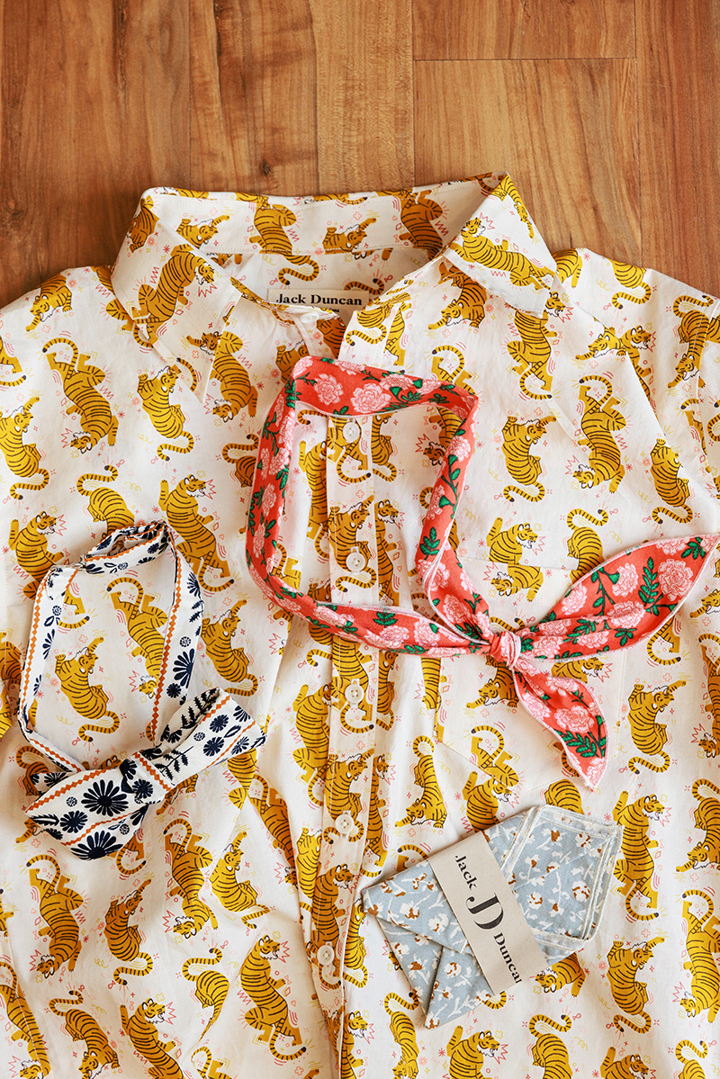 Dave’s eye for clothes is in his genes—courtesy his grandfather, Jack Duncan. The “stylish man and cool dude” for whom the collection is named smiles down from a photo in The Shopette. Wearing a rust-hued blazer and tie in his home of New Zealand, the candid shot packs as much pizzazz as the brand’s jungle-patterned fabrics.